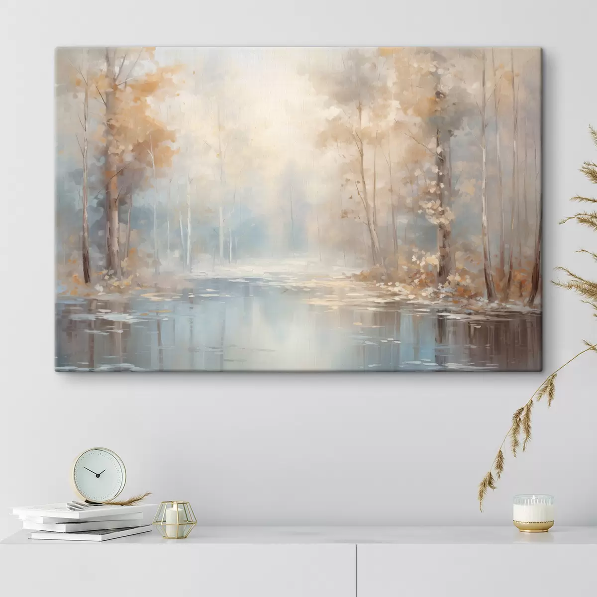 Fototapete Landschaft Ölgemälde Nachahmung eines ruhigen Flusses reflektiert das weiche Licht, umgeben von Herbstbäumen s43167