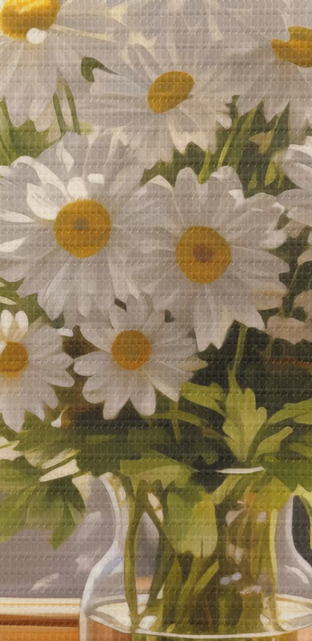Gemälde Ölgemälde Nachahmung einer Vase mit weißen Gänseblümchen auf einer Fensterbank, sonniger Tag, warme Farben Palette Art. s43171