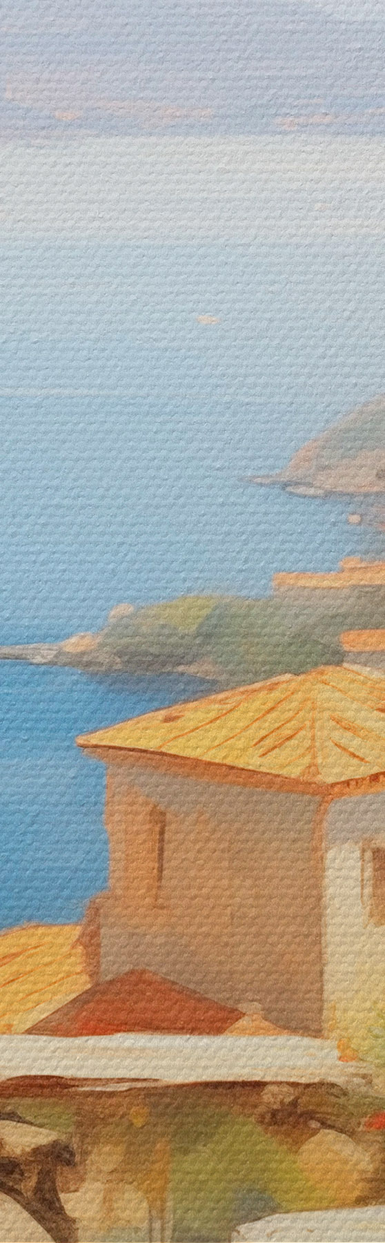 Fototapete Ölgemälde Nachahmung von Balkon mit Blumen, mit Blick auf das Meer, Häuser an der Küste, sonniger Tag, blauer Himmel s43173
