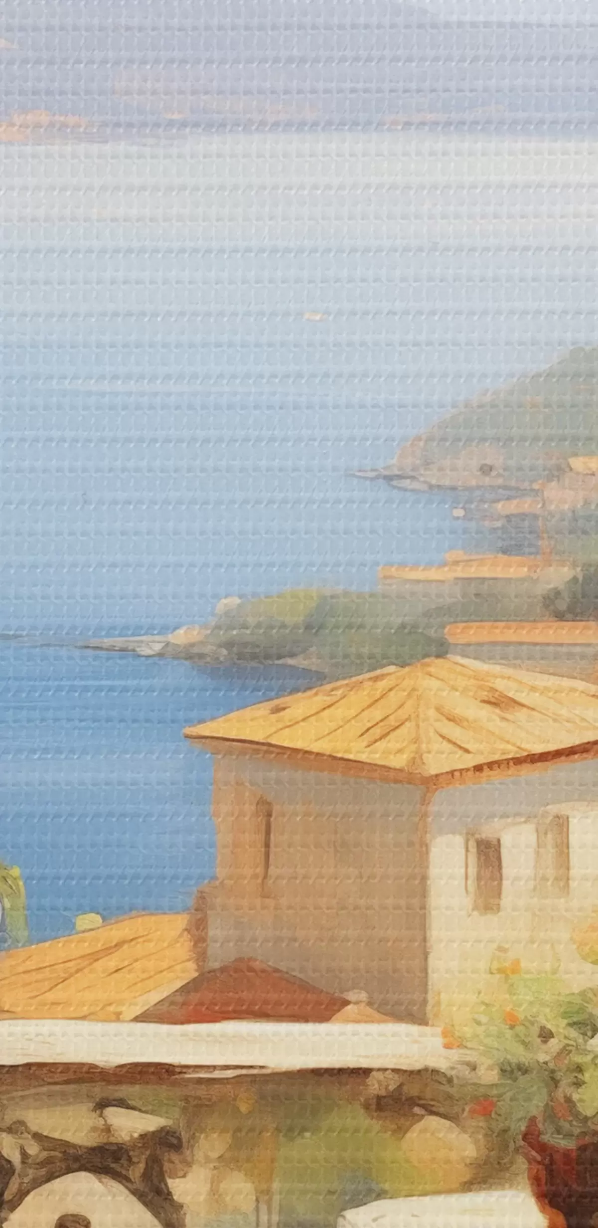 Gemälde Ölgemälde Nachahmung von Balkon mit Blumen, mit Blick auf das Meer, Häuser an der Küste, sonniger Tag, blauer Himmel Art. s43173