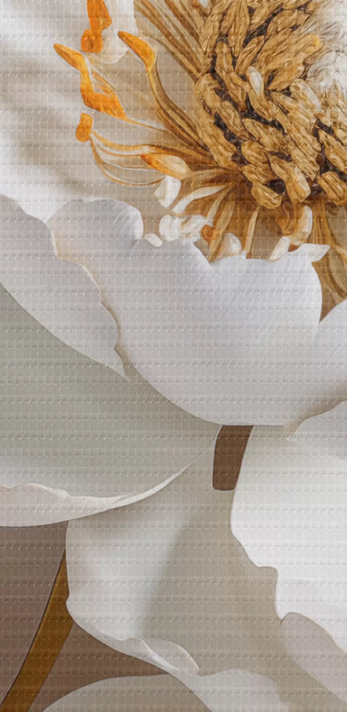 Fototapete Weiße zarte detaillierte dekorative Pfingstrose Blumen mit gelben Blättern, ist der Hintergrund eine hellgraue Farbe s43176