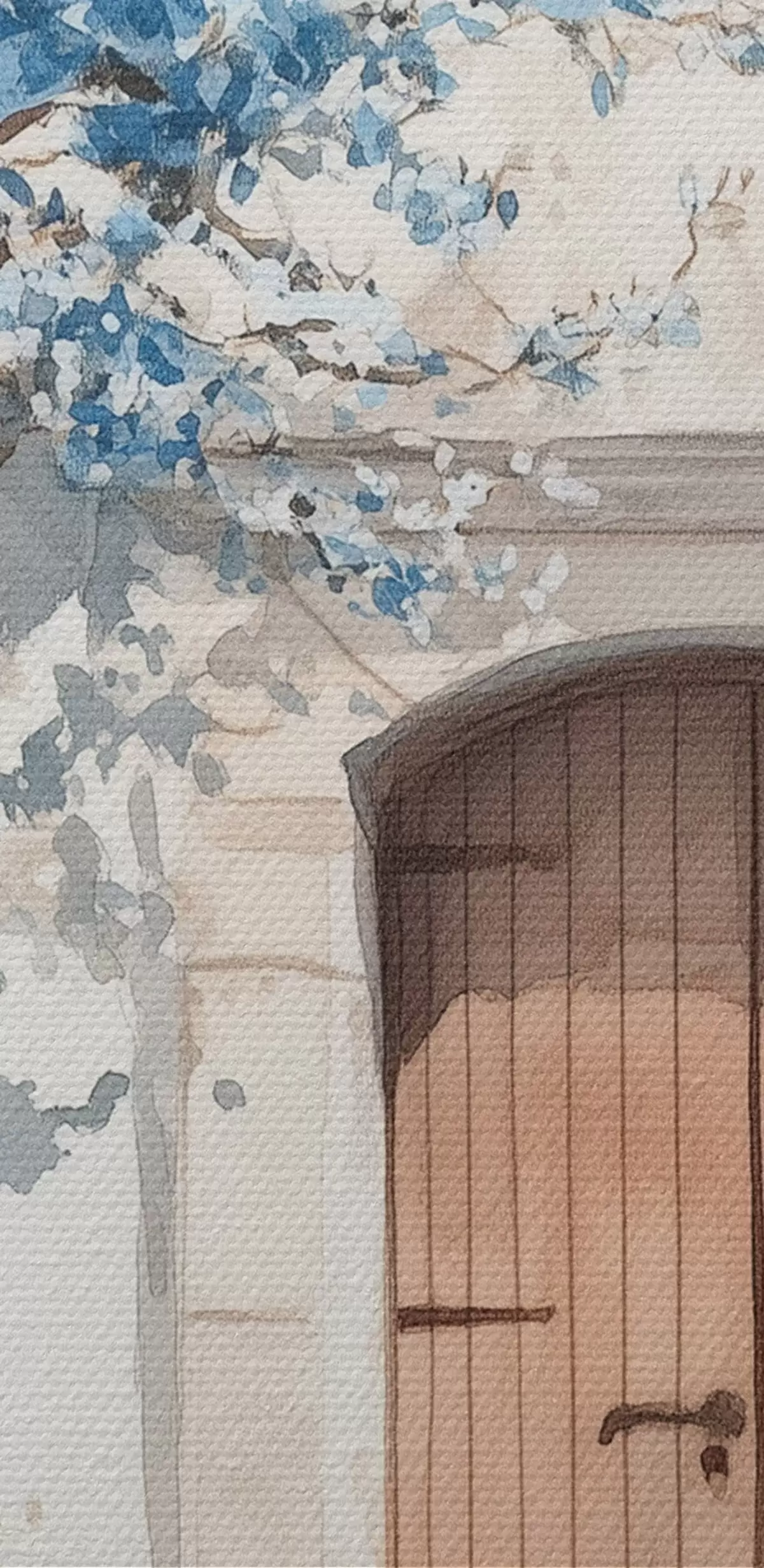 Fototapete Griechisches Haus mit schönem Baum, Architektur, Aquarellstil s43178