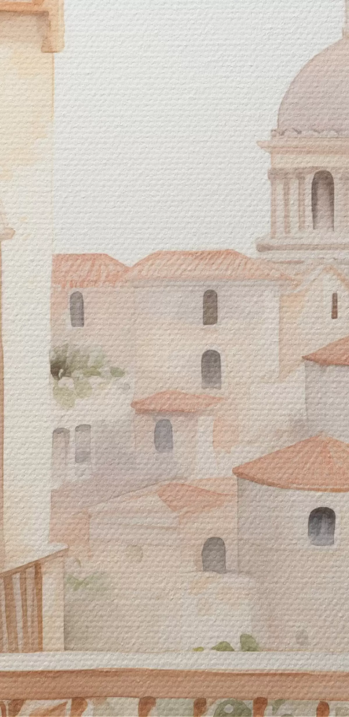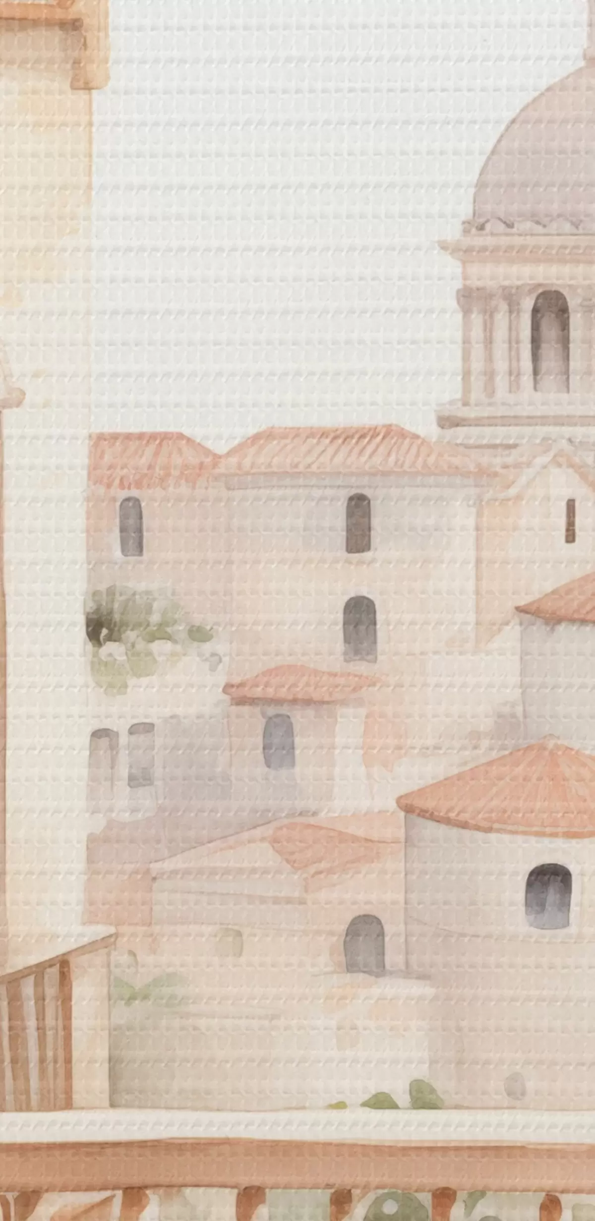 Fototapete Ästhetischer Sommerbalkon, Spanien, alte Architektur, Blomming, Aquarellstil s43180