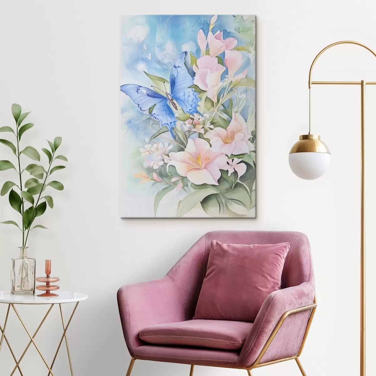 Gemälde Blauer Schmetterling und rosa Blumen Art. s43296