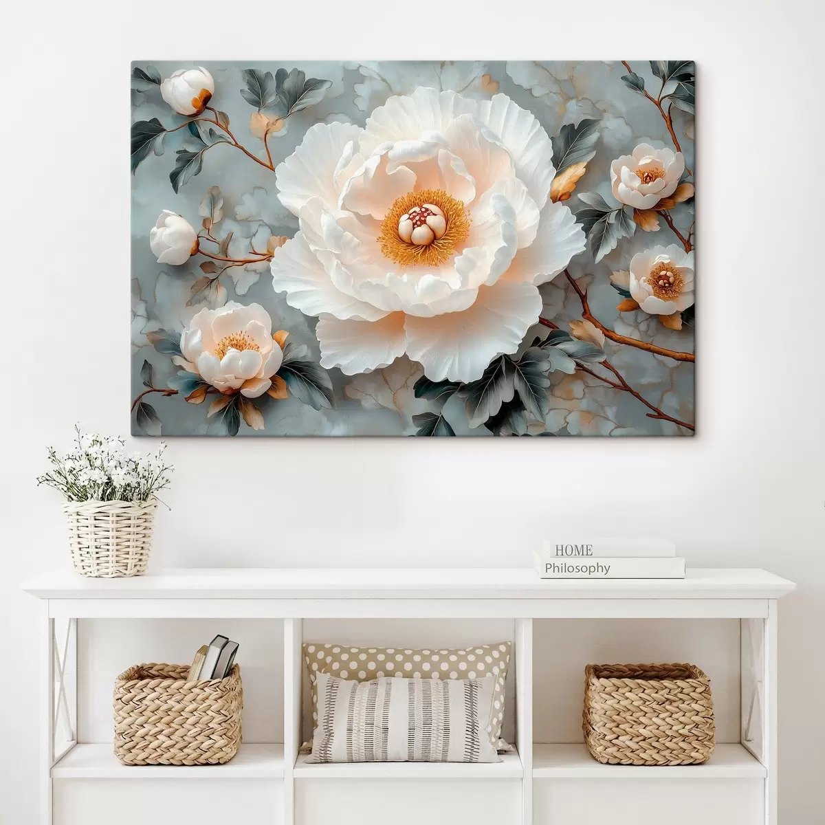 Gemälde Wunderschöne Pfingstrose vor einem Hintergrund aus Blättern und kleinen Pfingstrosen Art. s43315