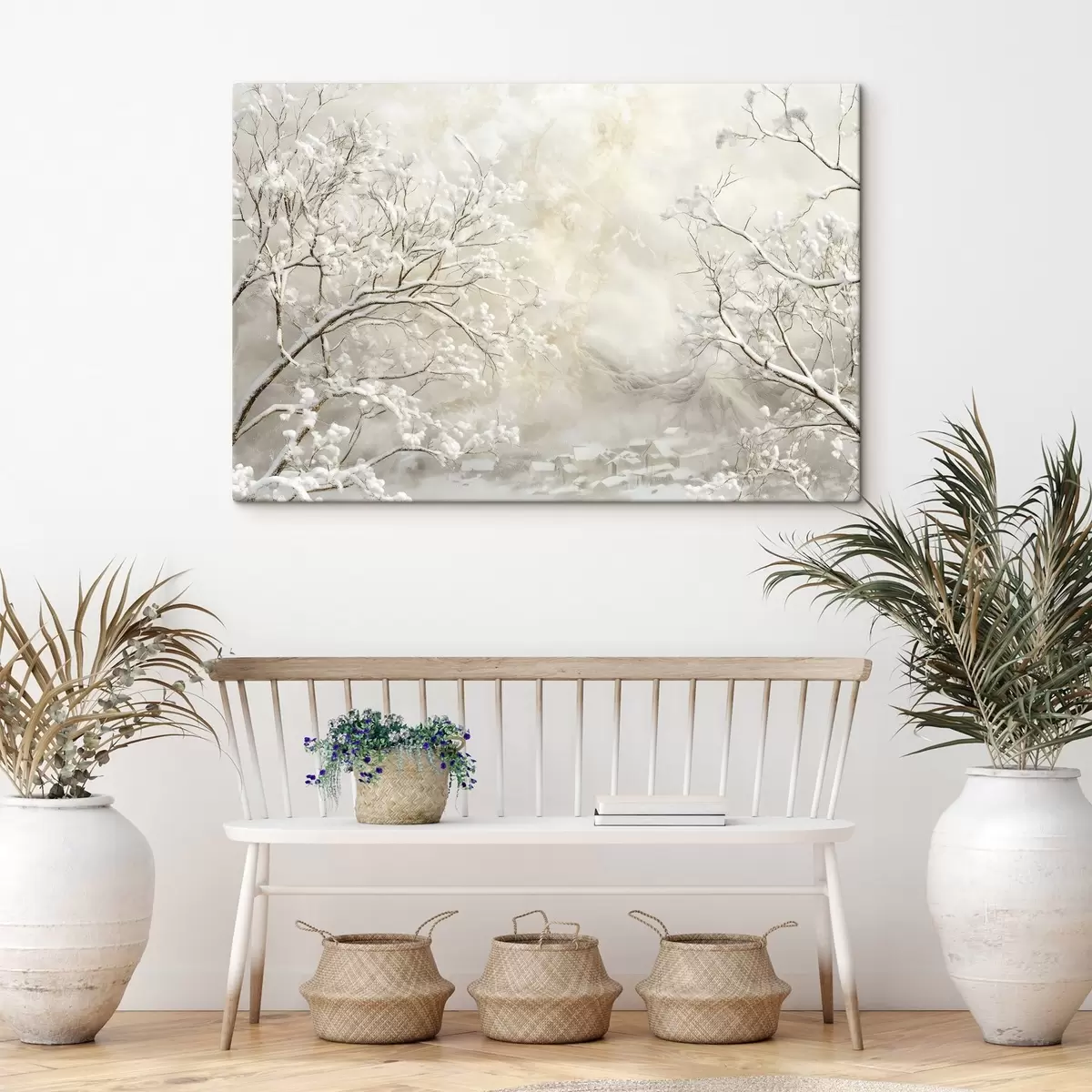 Gemälde Winterzweige mit Schnee vor dem Hintergrund eines Winterdorfs Art. s43321