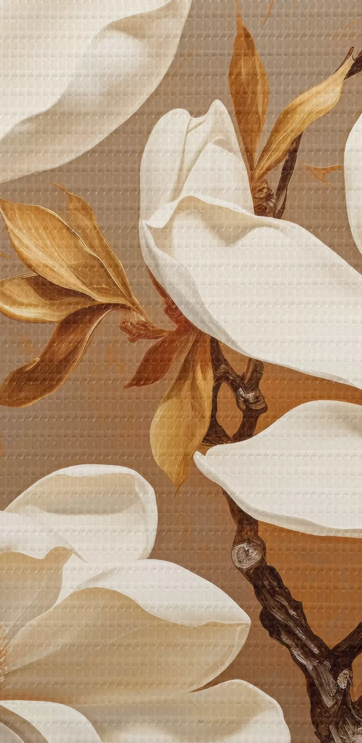 Fototapete Ölgemälde mit einer weißen Magnolie auf einem Zweig vor einem gelben Hintergrund s43361