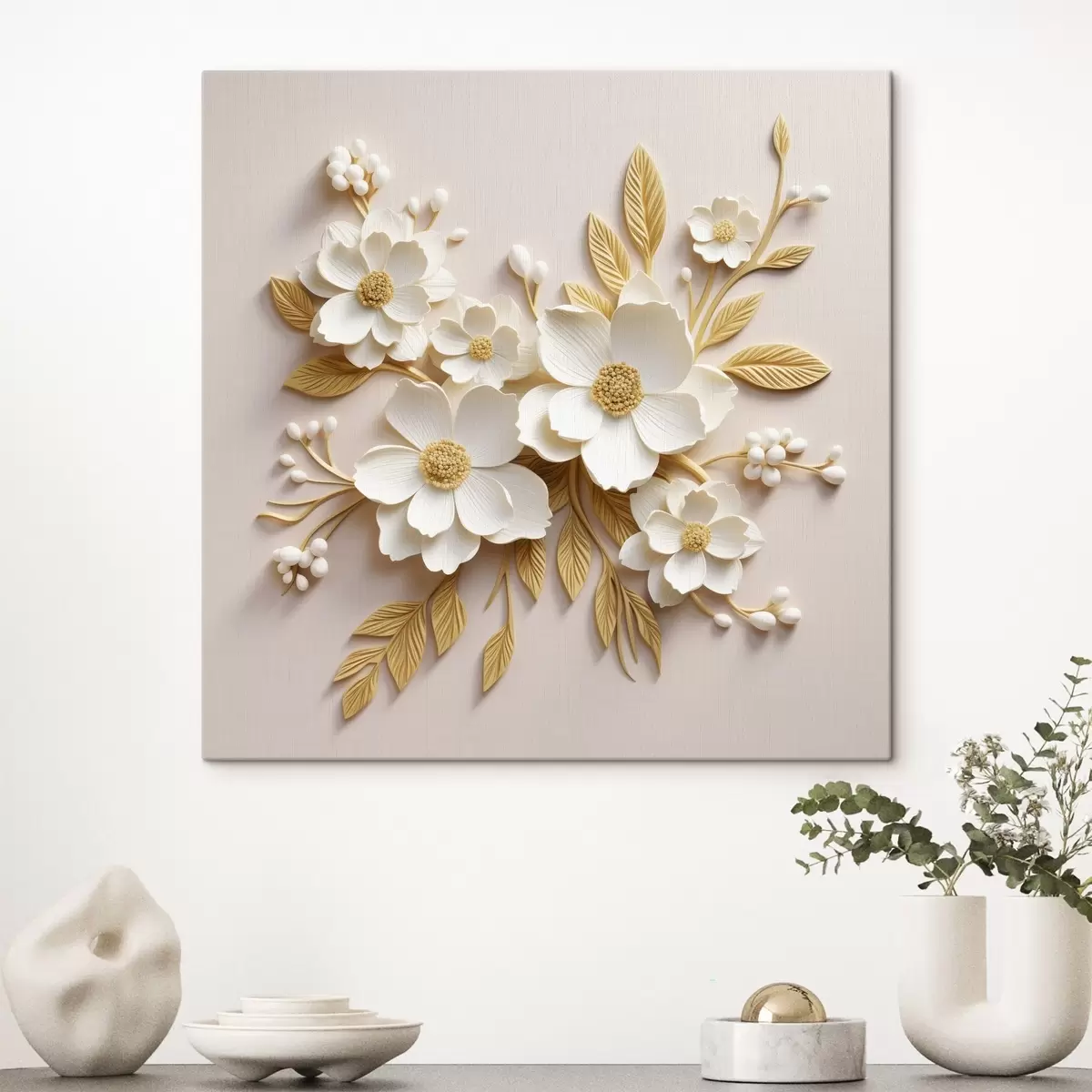 Gemälde 3D weiße Blumen mit Blättern auf einem cremefarbenen Hintergrund Art. s43383