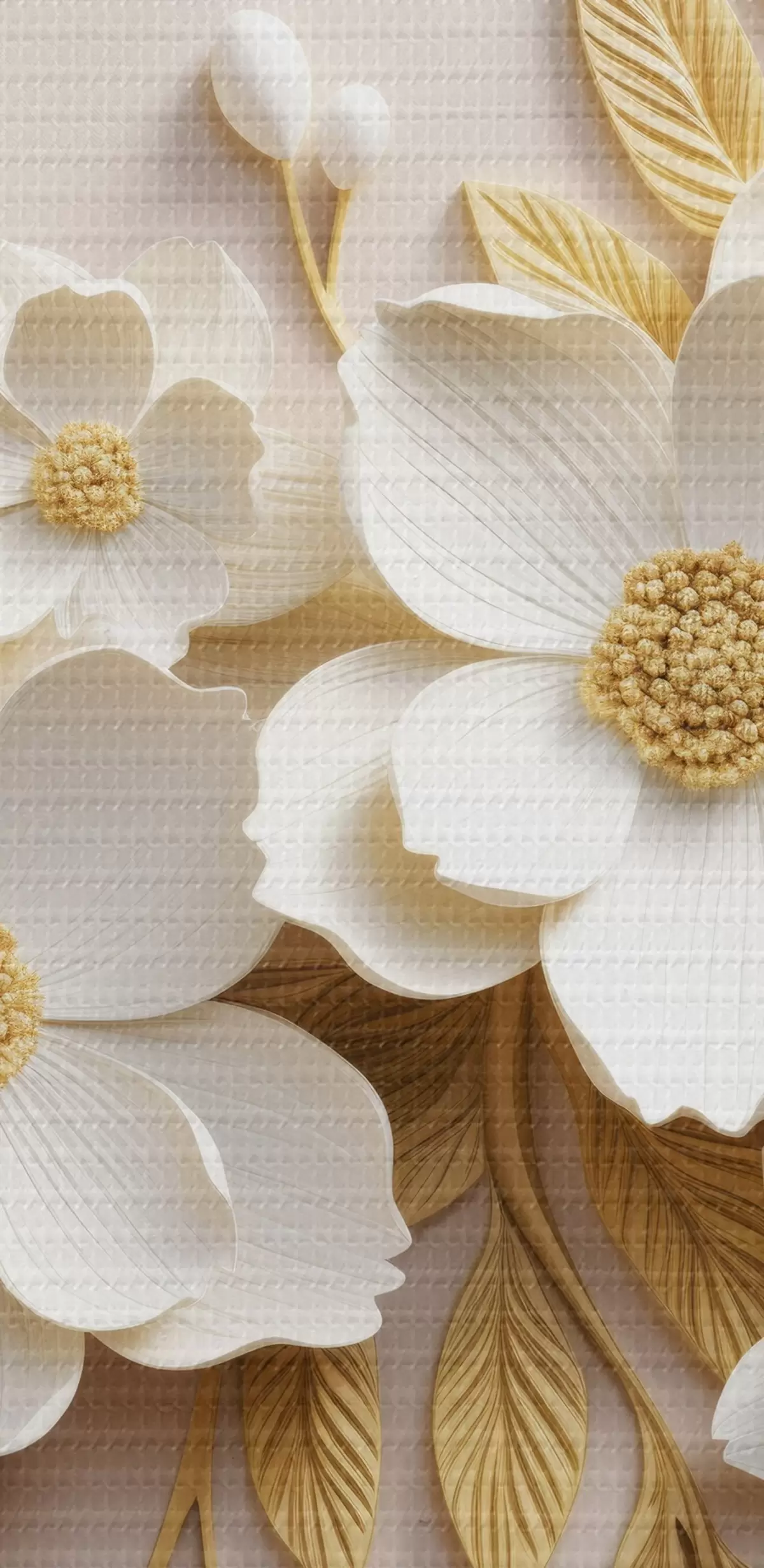 Fototapete 3D weiße Blumen mit Blättern auf einem cremefarbenen Hintergrund s43383