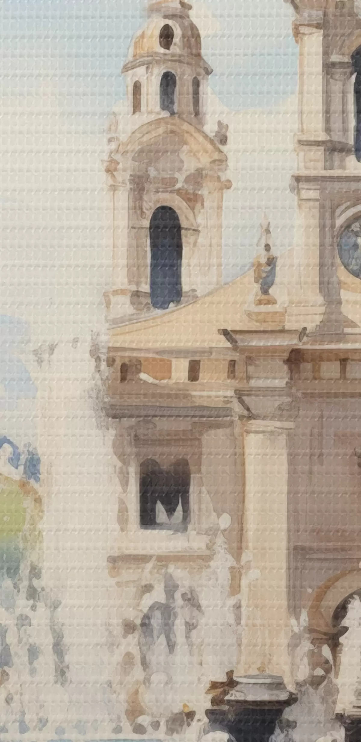 Fototapete Abstrakte Stadtlandschaft mit Turm und Springbrunnen auf einem Stadtplatz, Berge in der Ferne, Aquarellstil s43397