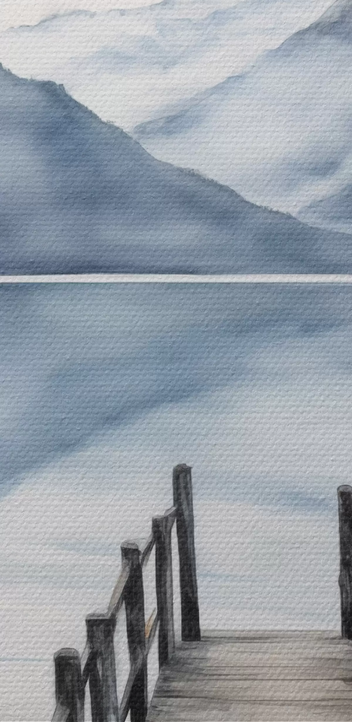 Gemälde Ein hölzerner Steg ragt in einen ruhigen See hinaus, umgeben von Bergen und immergrünen Bäumen, Aquarellstil Art. s43405
