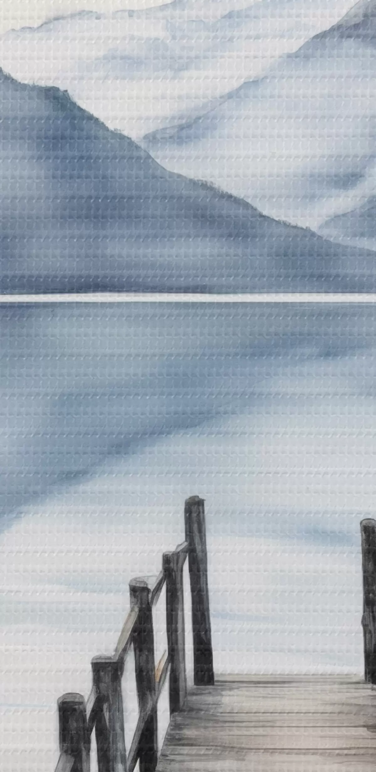 Fototapete Ein hölzerner Steg ragt in einen ruhigen See hinaus, umgeben von Bergen und immergrünen Bäumen, Aquarellstil s43405