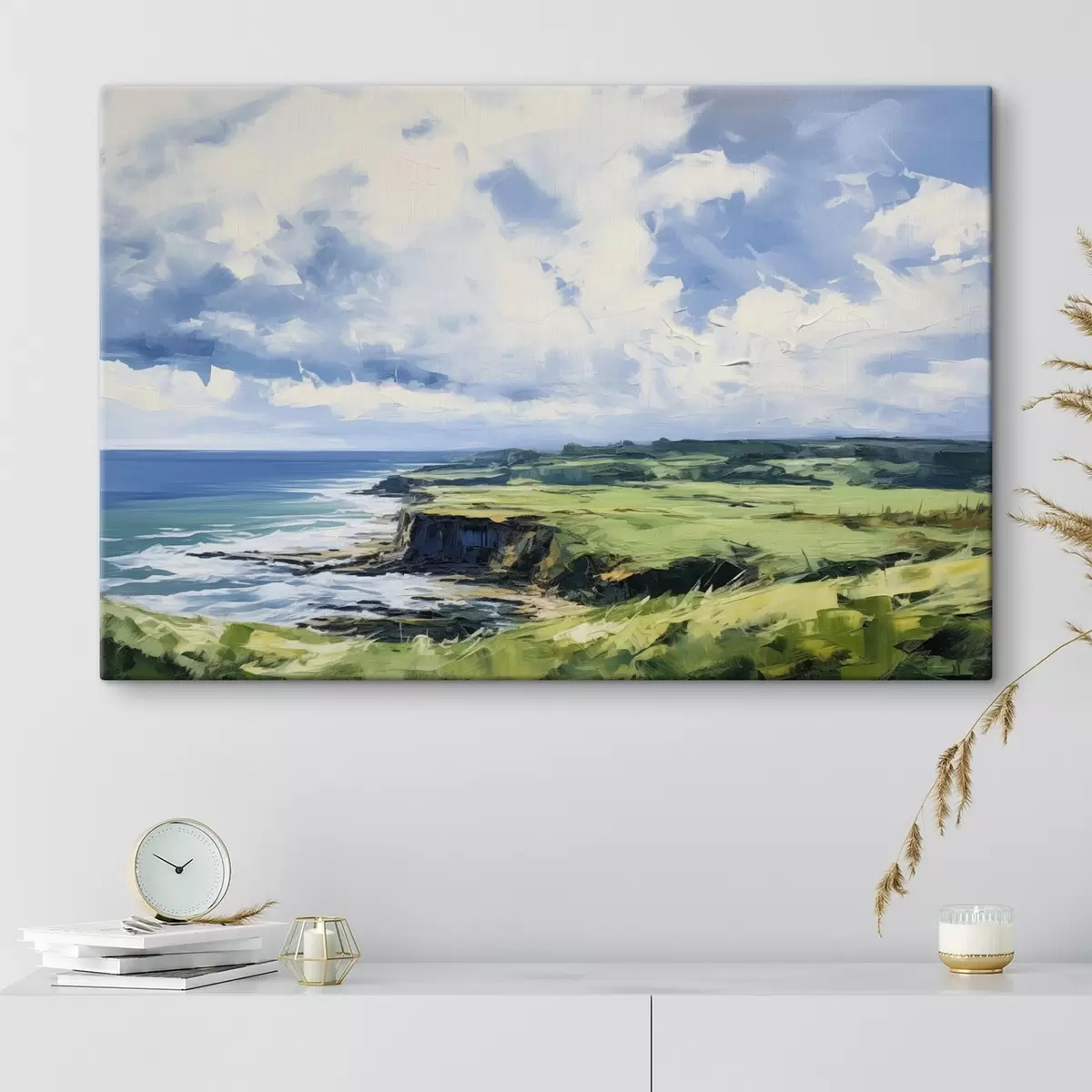 Gemälde Grünes Feld mit einer Klippe an der Küste, blaues Meer mit Wellen, bewölkter Himmel, minimalistische moderne Ölgemälde Nachahmung Art. s43406