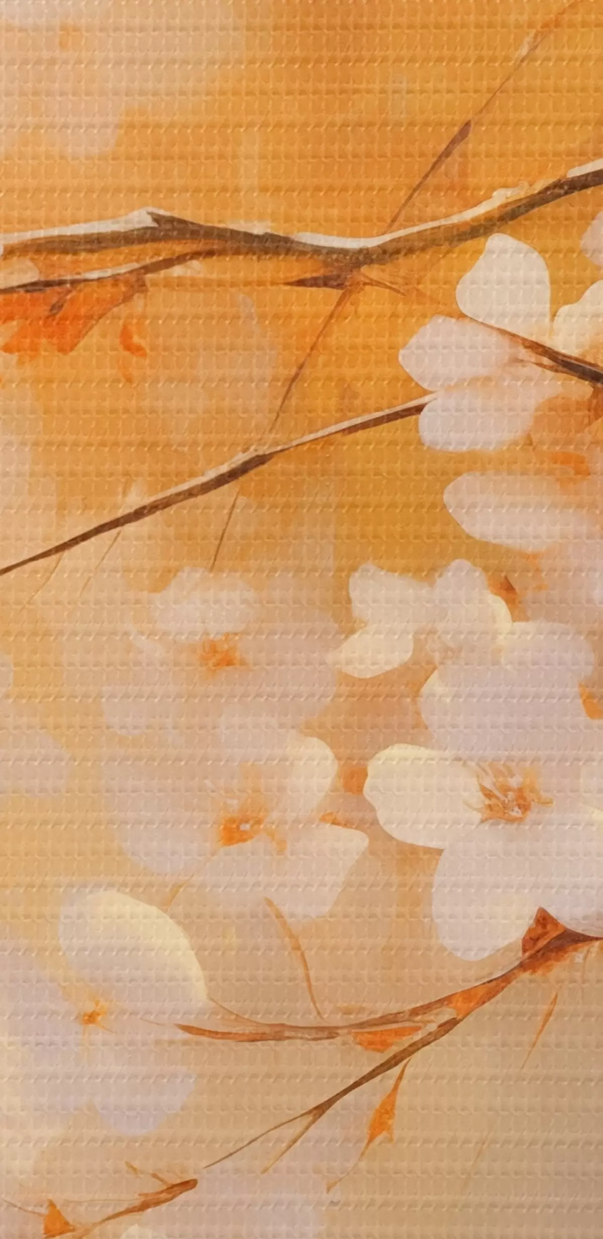 Gemälde Kirschblütenzweige mit orangefarbenen Blüten, warme Farbpalette, vor einem unscharfen Hintergrund aus gelben Farbtönen Art. s43407