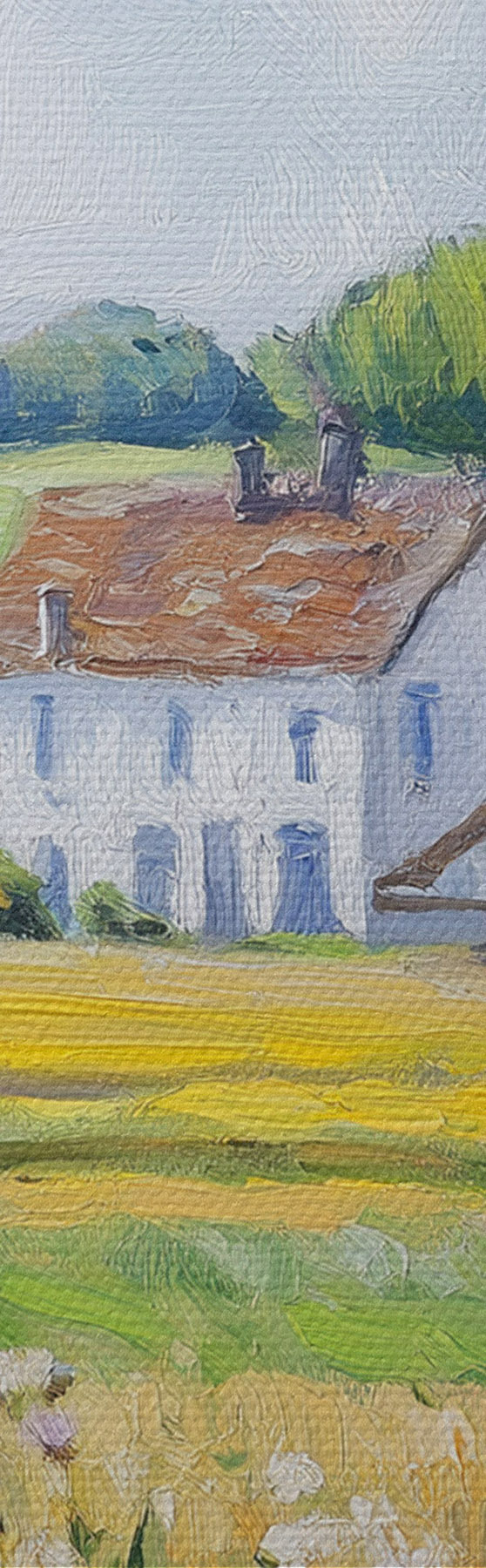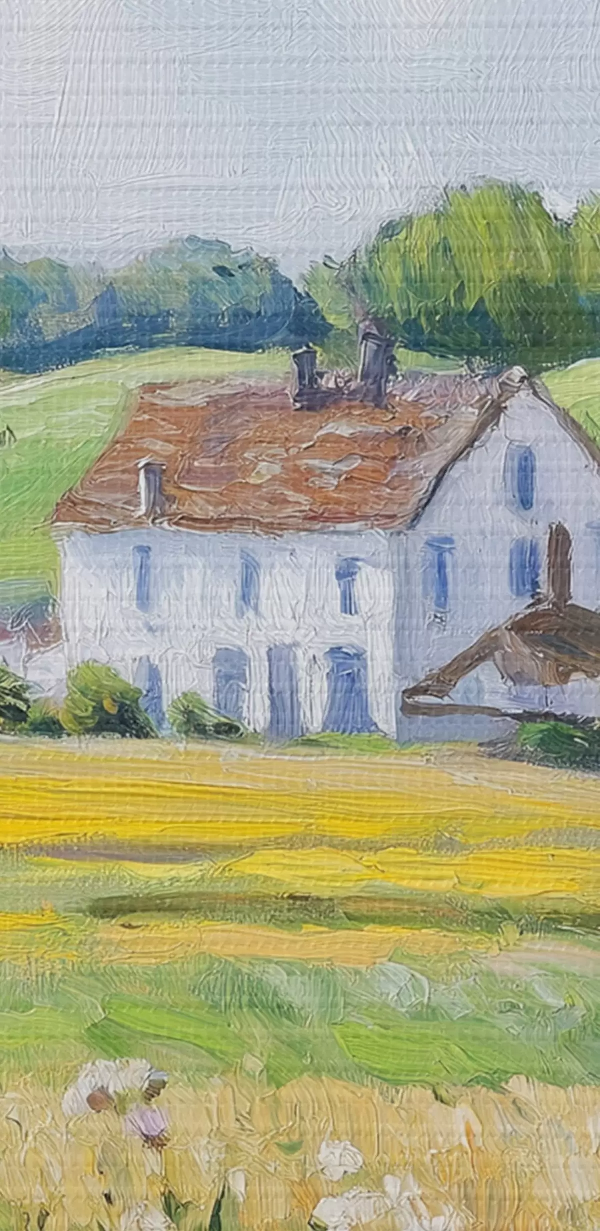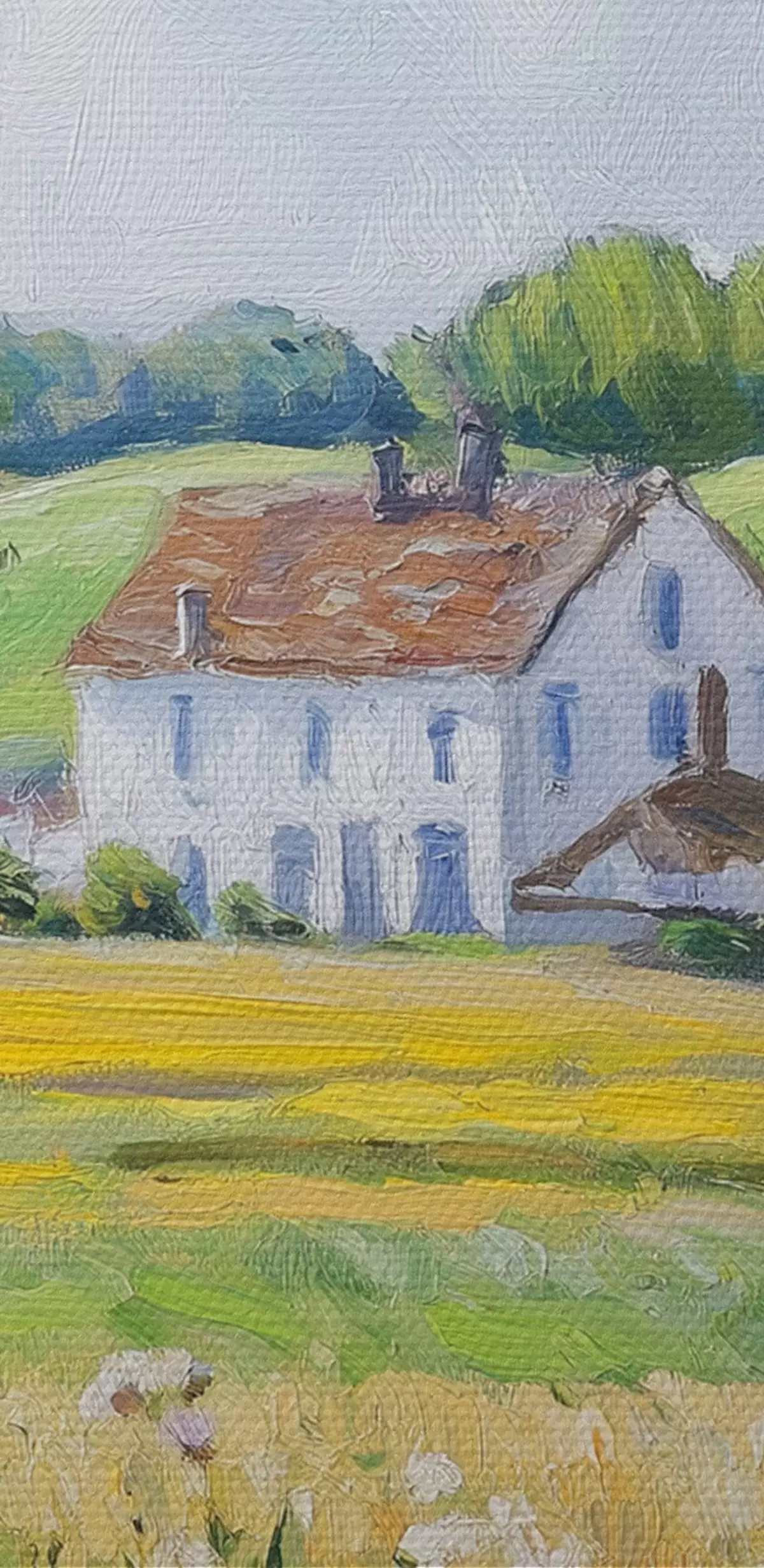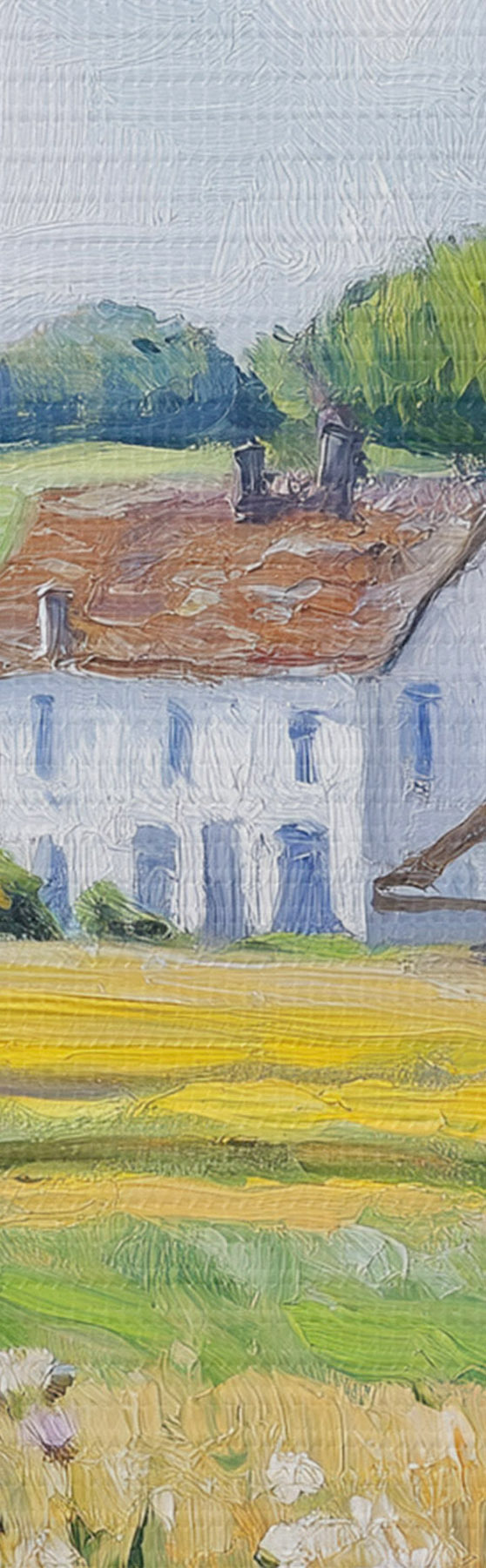 Fototapete Dorflandschaften im Holzfenster, Blumen, Felder, Öl-Stil, Bauernhaus s43888