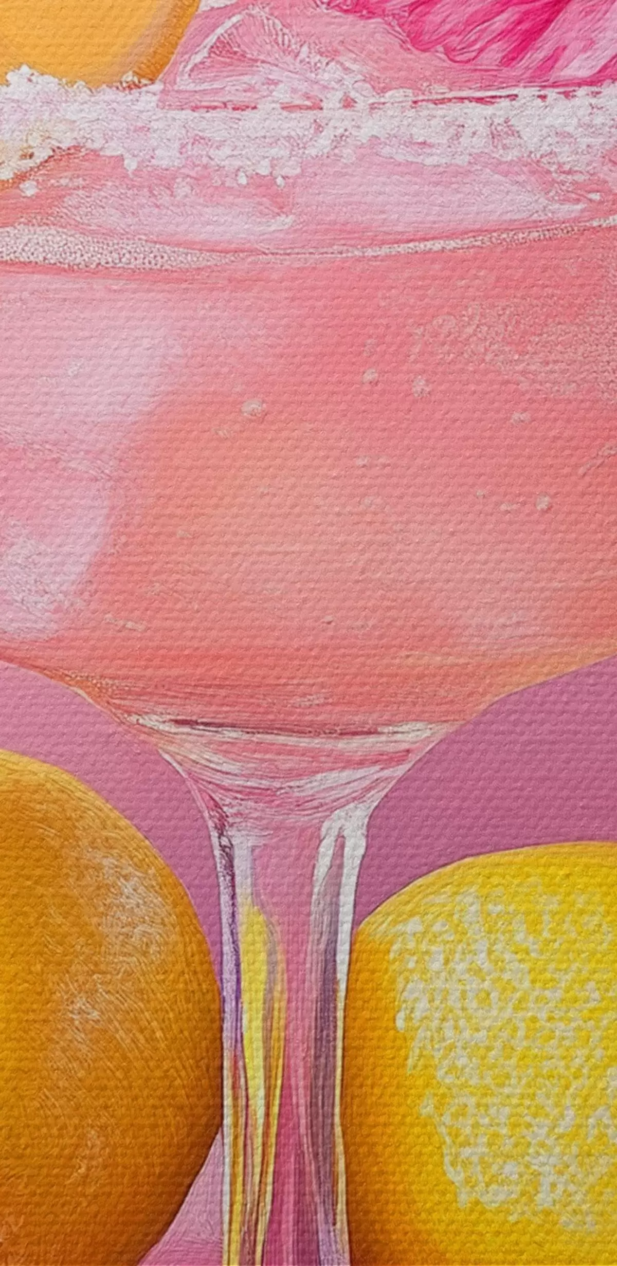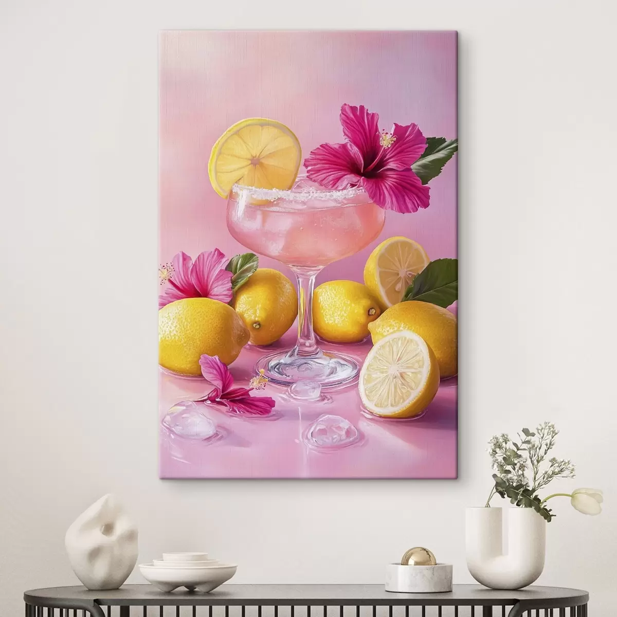 Gemälde Sommercocktail mit Blumen und Zitronen, rosa Farben, Aquarellstil Art. s43895
