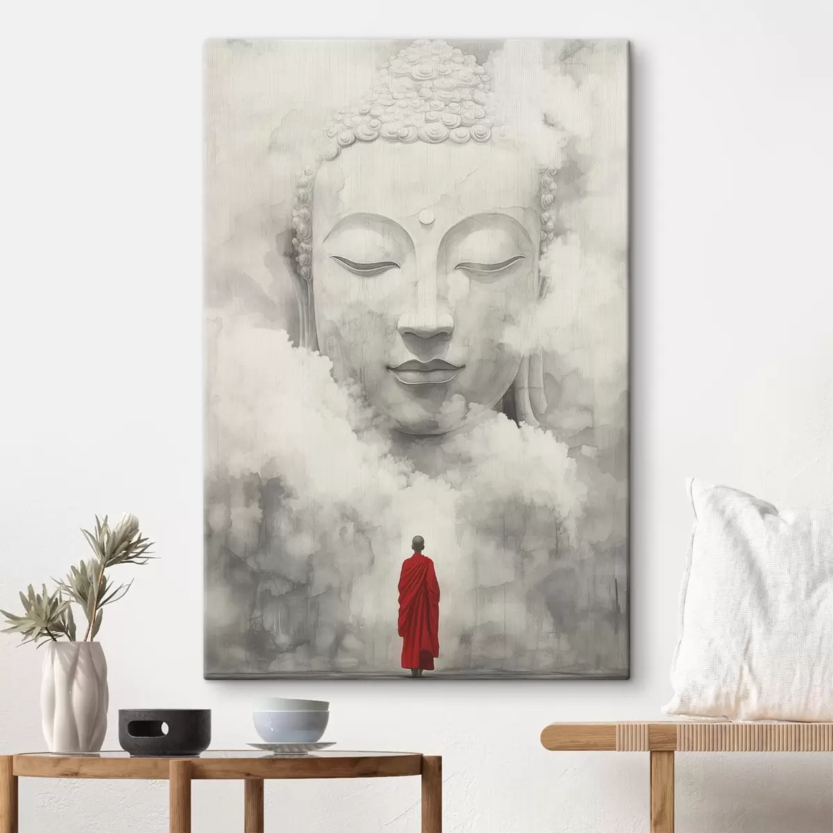 Gemälde Buddhismus, Mönch in der roten Robe, Nebel, Aquarellstil Art. s44007