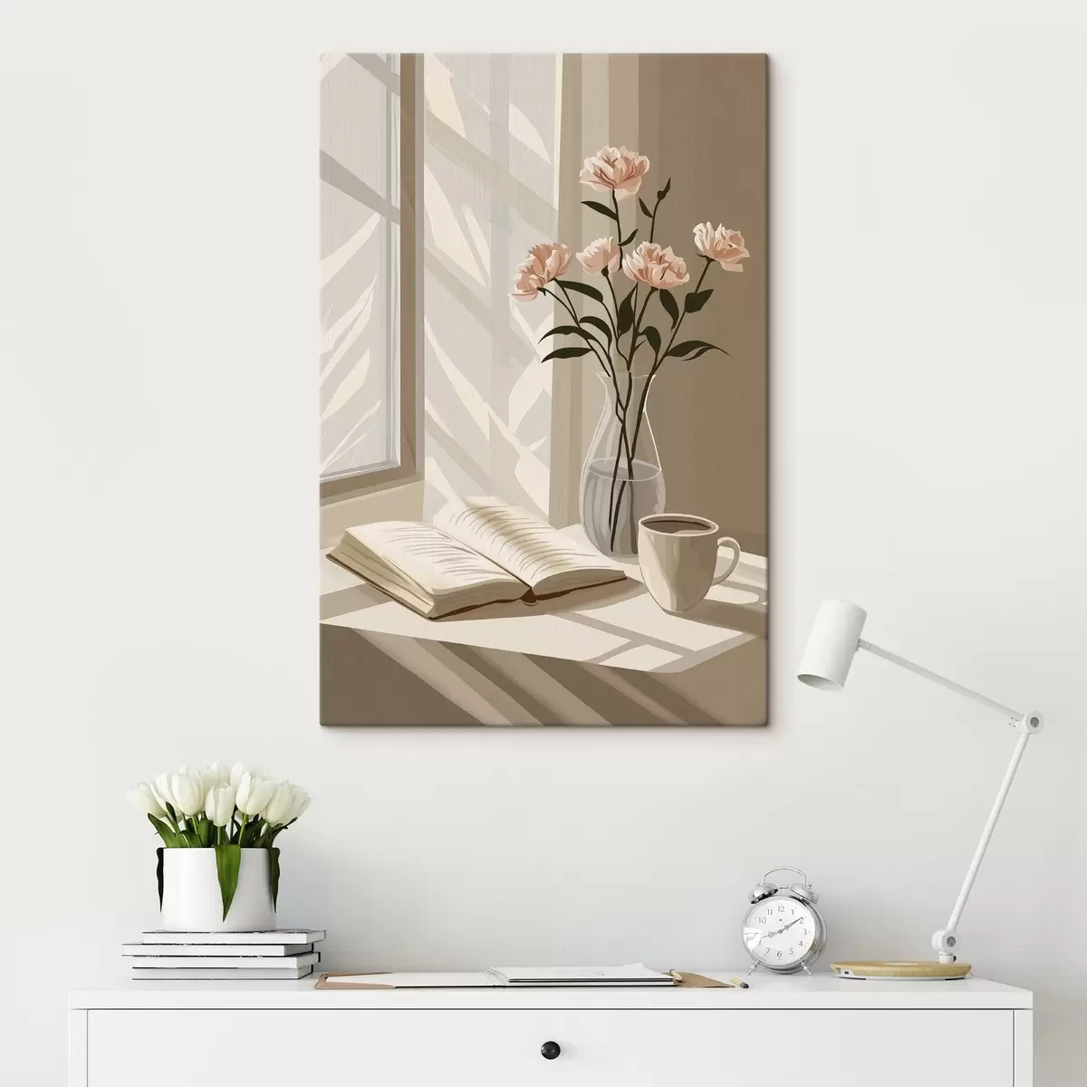 Gemälde Gemütlicher Morgen mit Kaffee und Buch, rosa Blumen, Abstraktion Art. s44013
