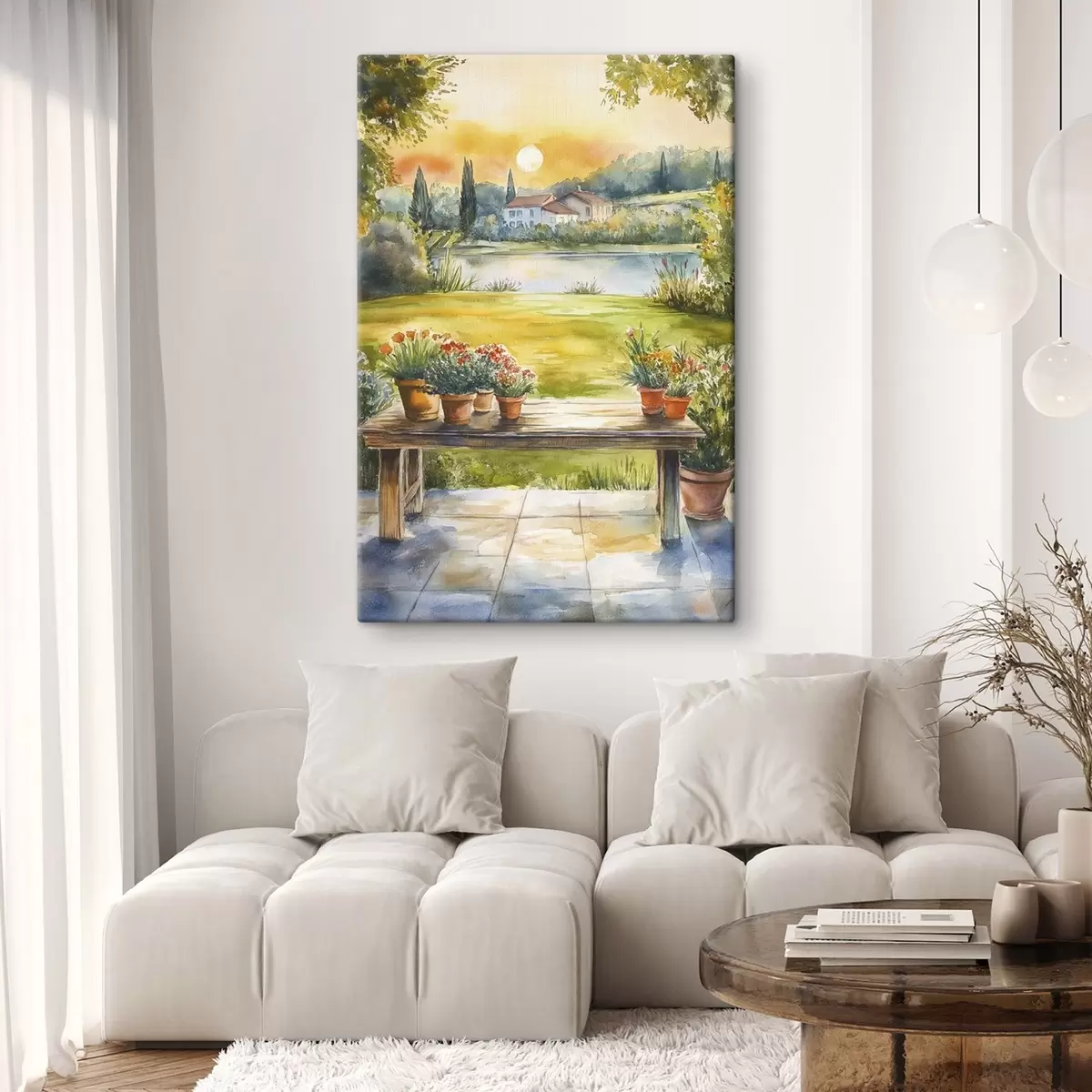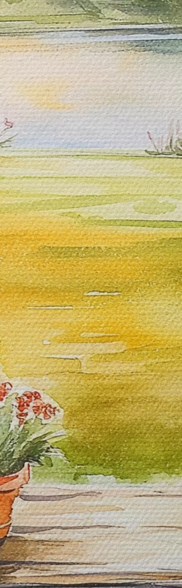 Gemälde Dorf im Sonnenuntergang, rustikal, Sommerblumen, See, Aquarellstil Art. s44016