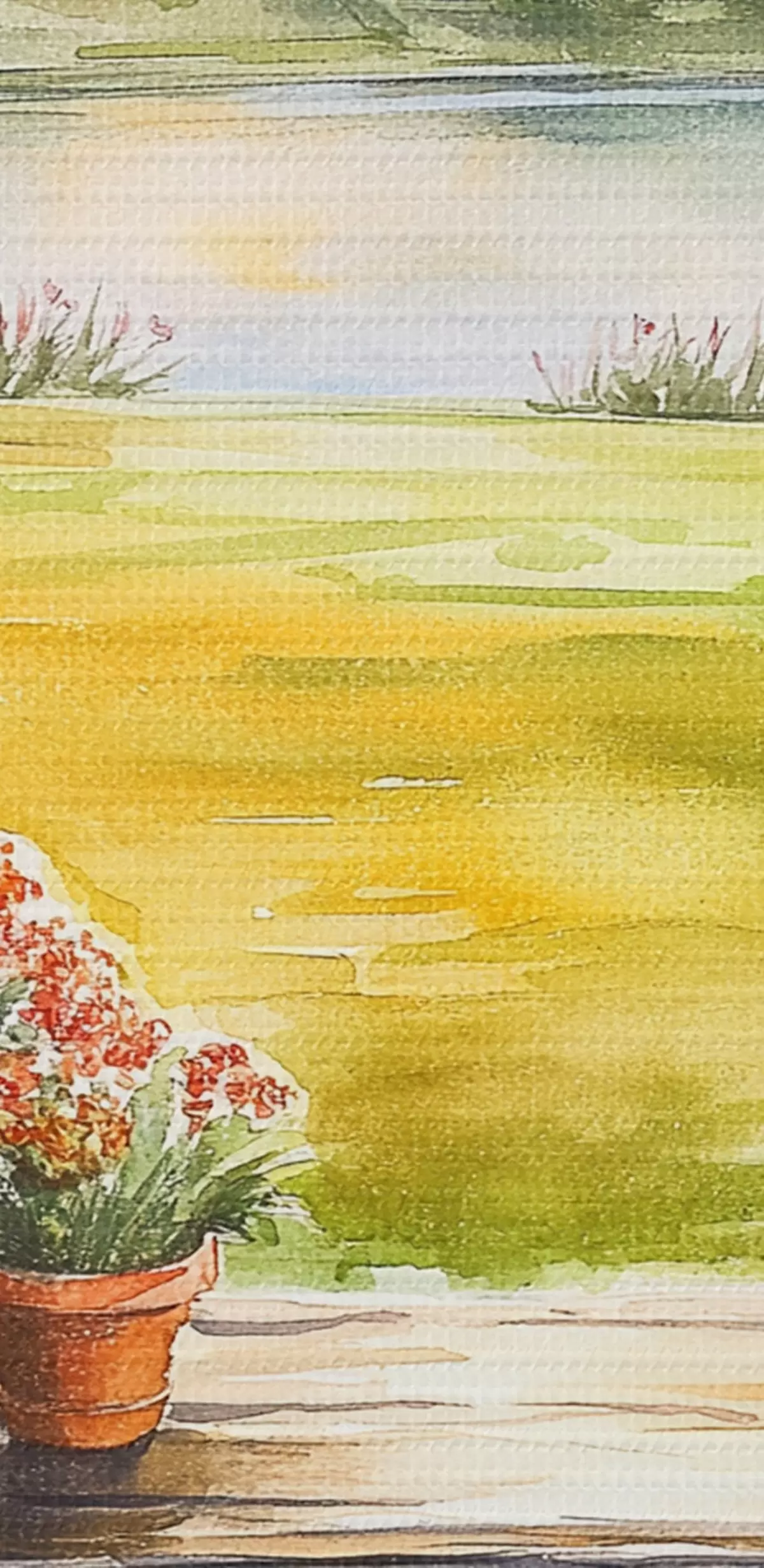 Fototapete Dorf im Sonnenuntergang, rustikal, Sommerblumen, See, Aquarellstil s44016