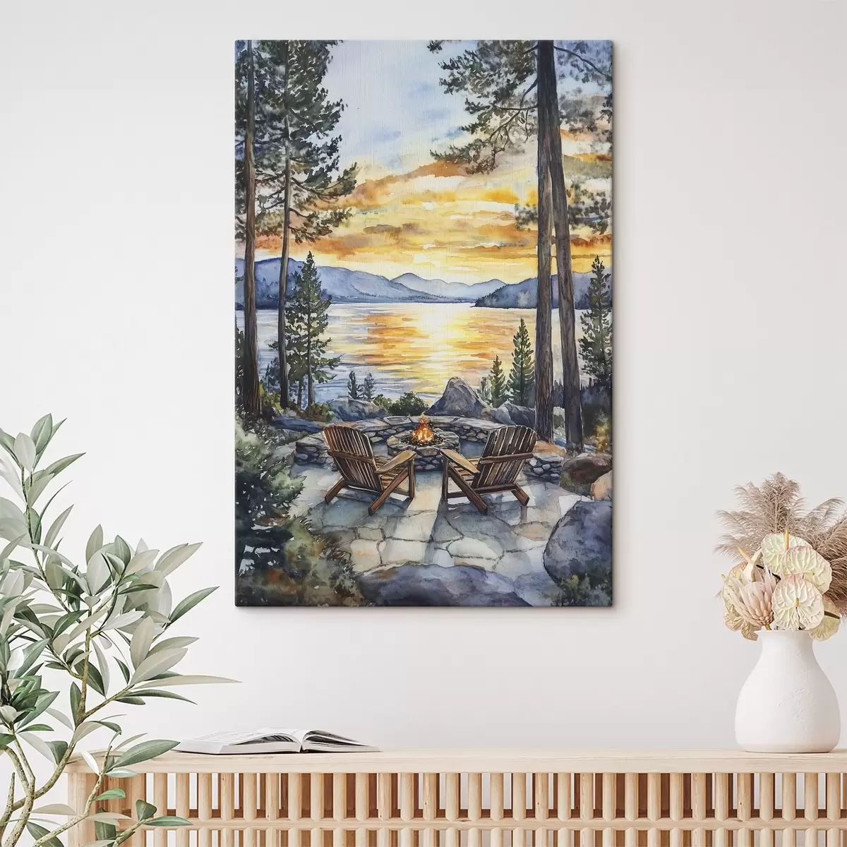 Fototapete See mit Bergen auf den Sonnenuntergang, Reisen, gemütlichen Kamin, Aquarell s44018
