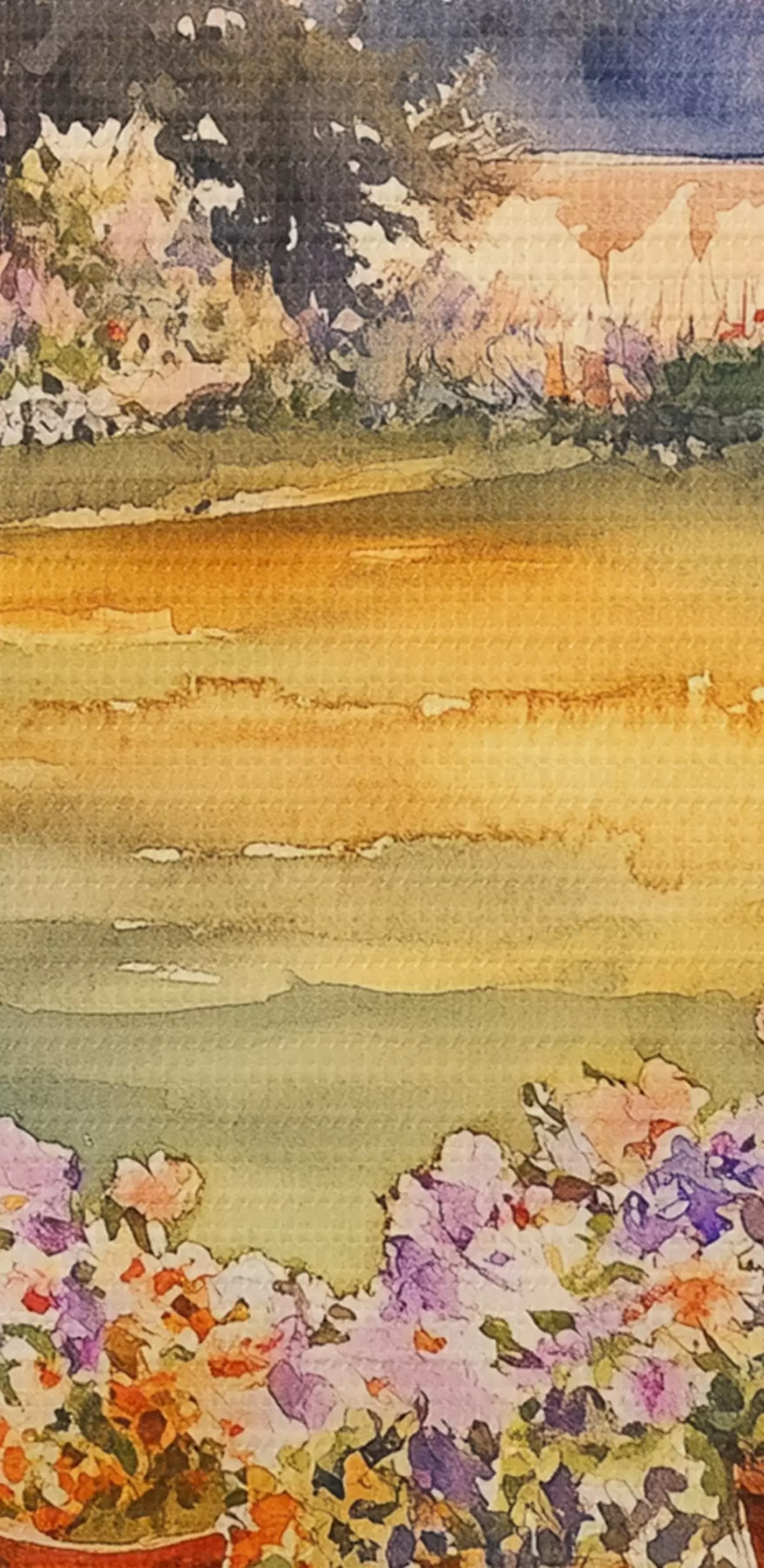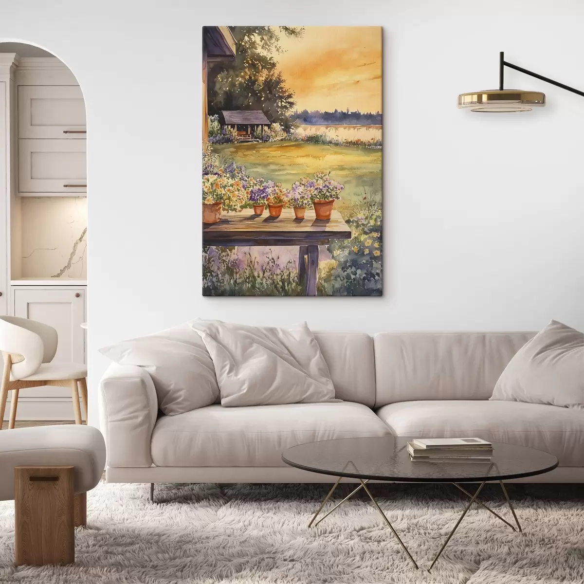 Gemälde Blumen im Dorfgarten, Sonnenuntergang Farben, Aquarell-Stil Art. s44019