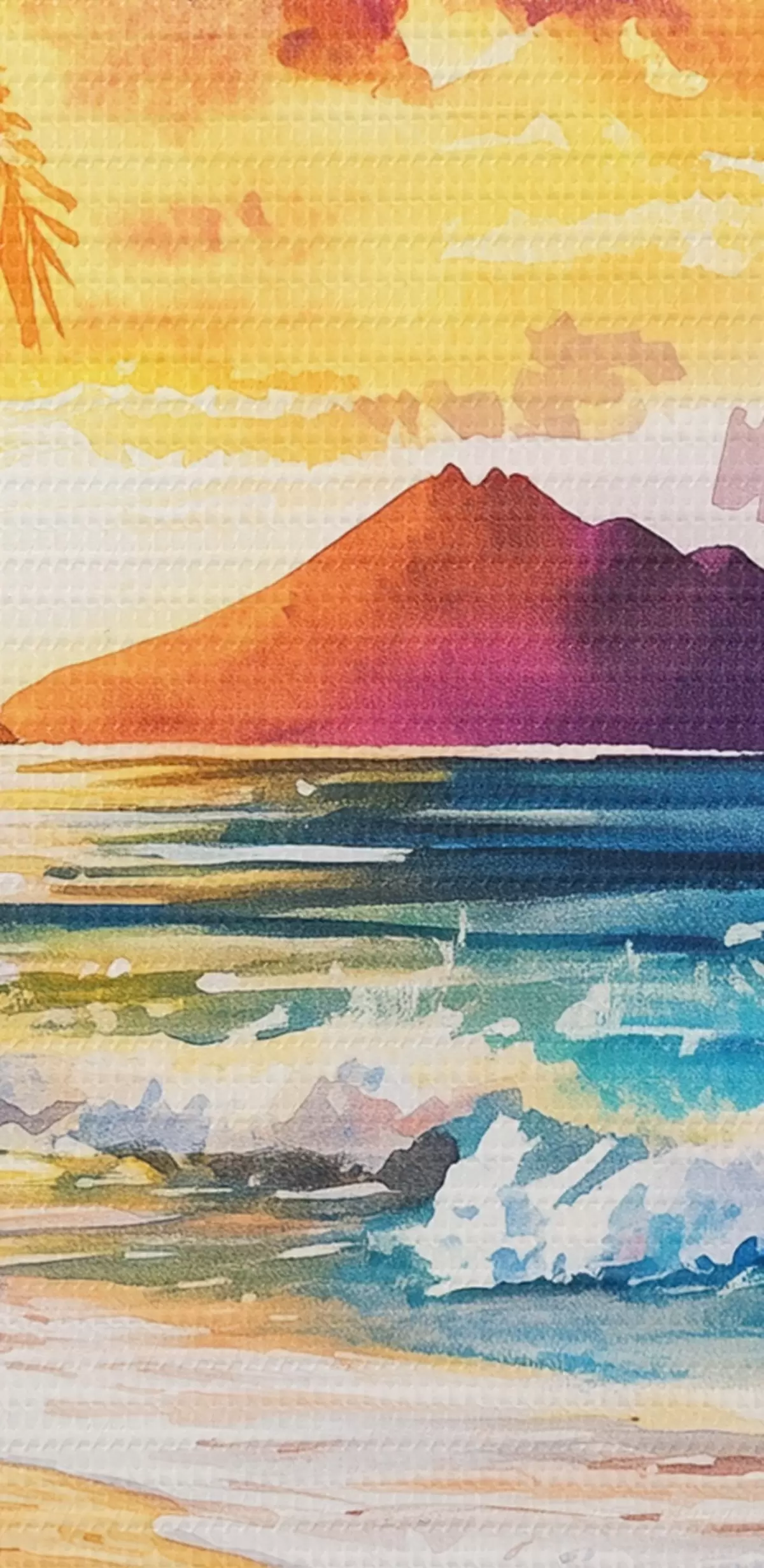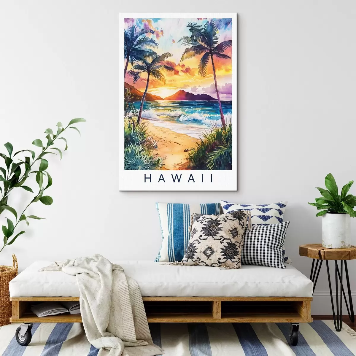Gemälde Sonnenuntergang auf der Insel Hawaii, Palmen, Meer, bunten Himmel, Aquarell-Stil Art. s44142