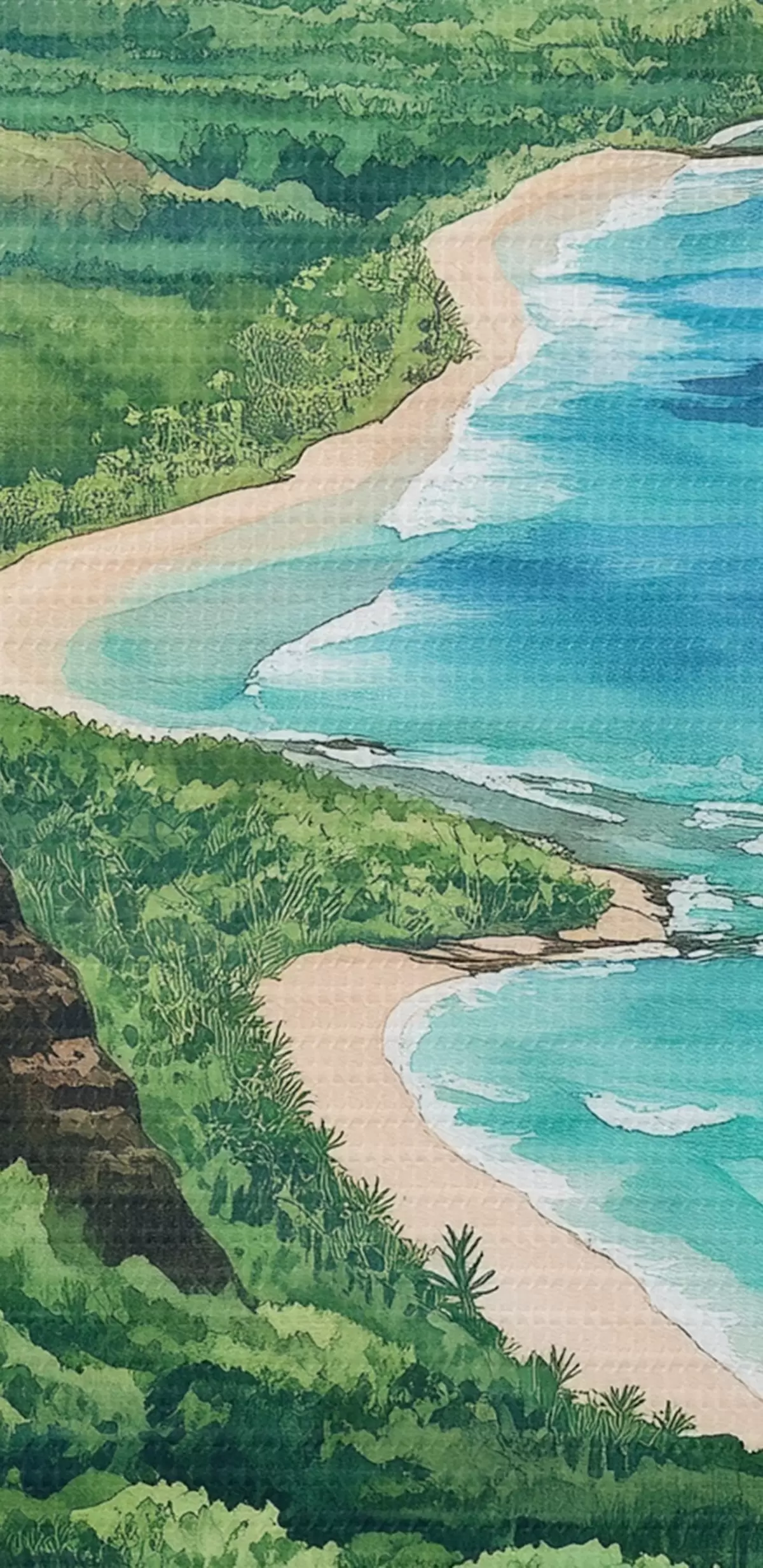 Gemälde Grüne Berge, Hawaii, Ozean, tropisch, Aquarellstil Art. s44143