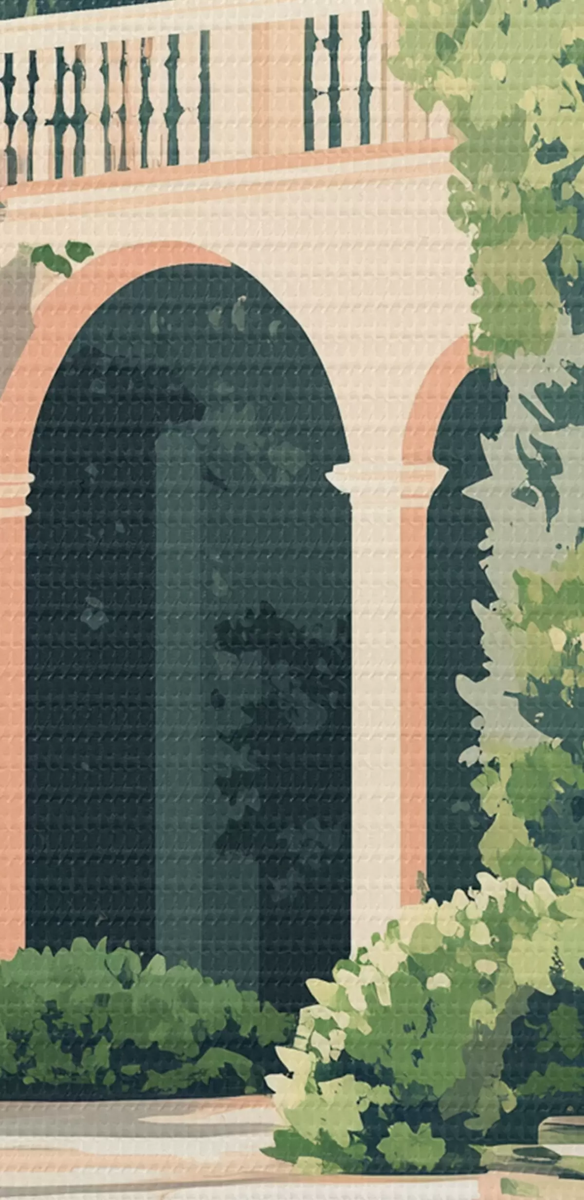 Gemälde Mediterrane Architektur, tropische Natur, flacher Stil, Villa mit Garten Art. s44150