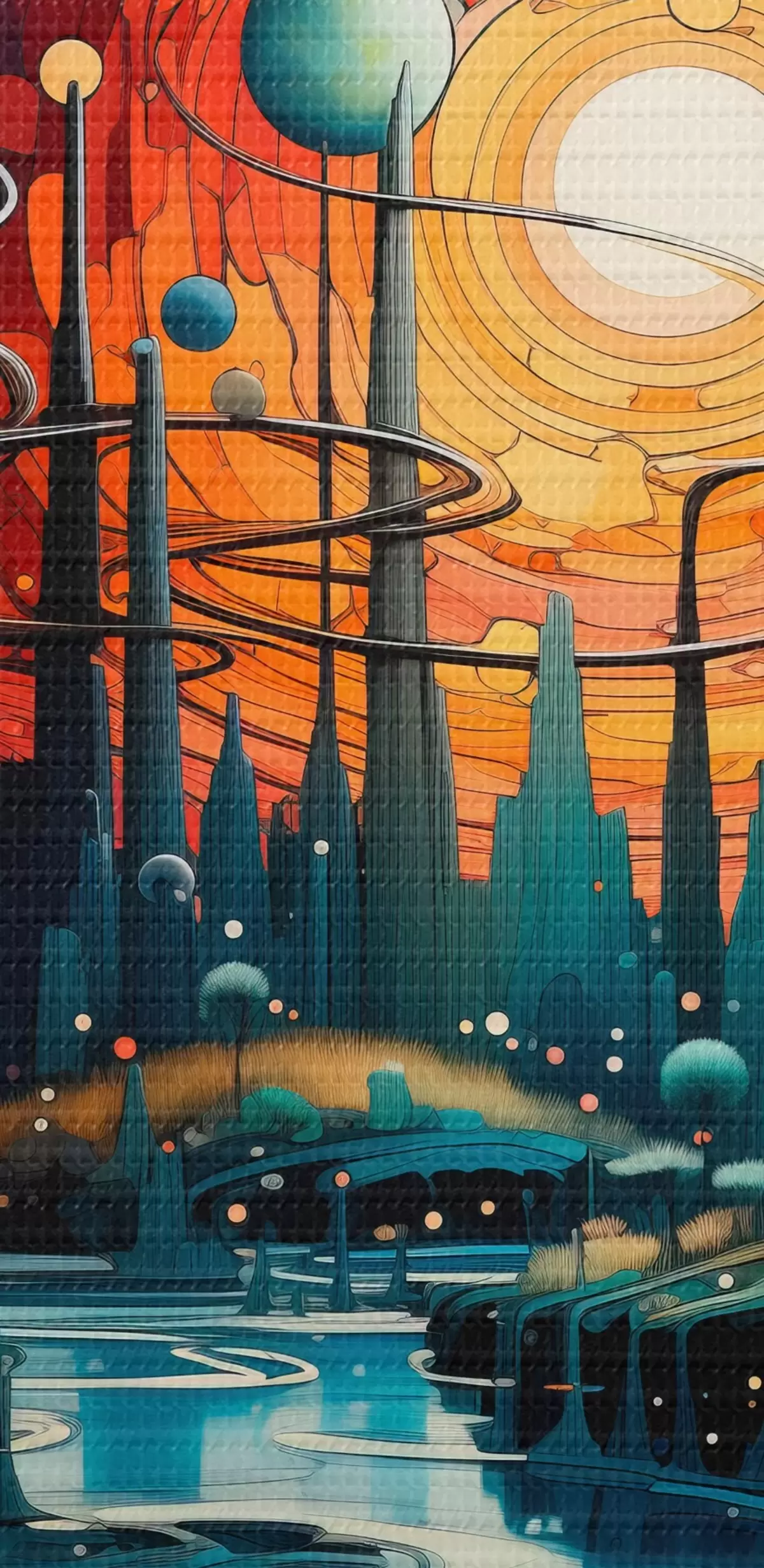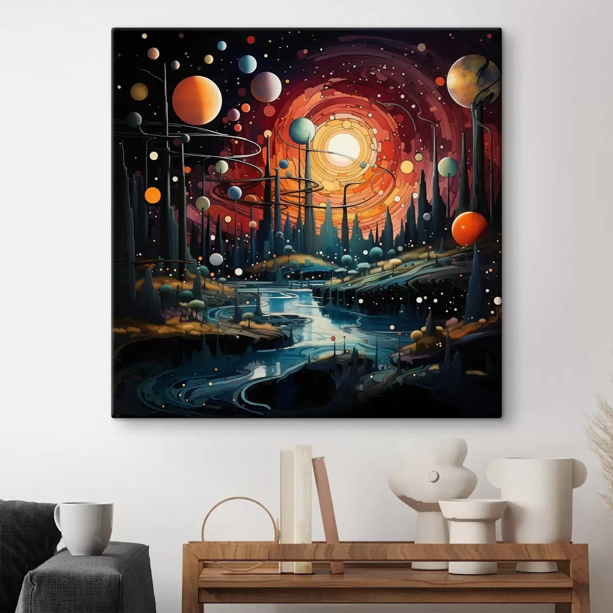 Gemälde Helle und fantastische Landschaft einer fremden Welt mit Planeten und einem Fluss Art. s44249