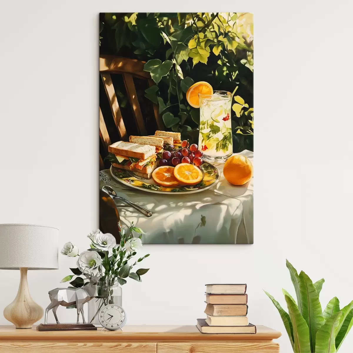 Gemälde Ästhetisches Picknick im Sommergarten, belegte Brote, Orangen, Limonade Art. s44306
