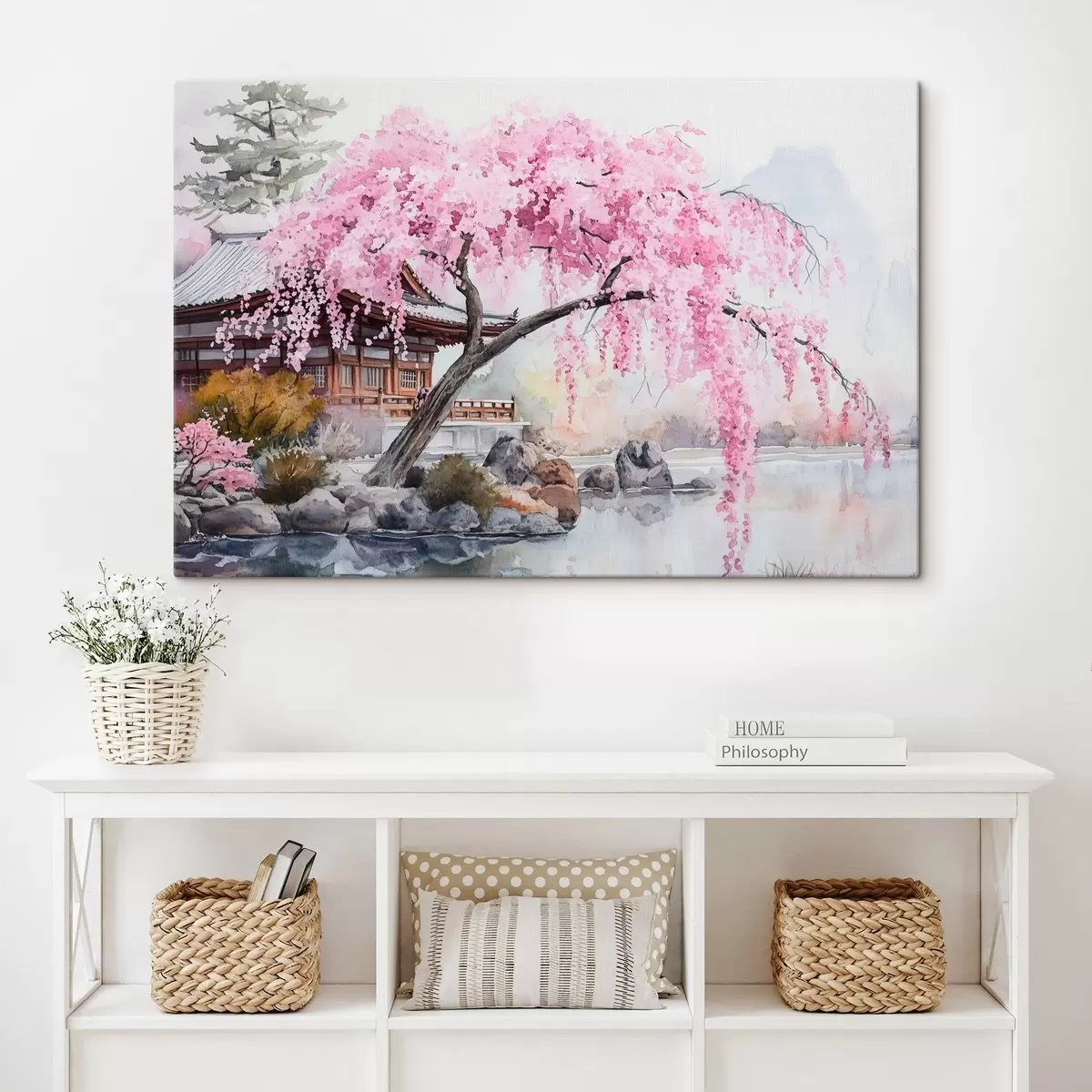 Gemälde Rosa Kirschbaum in der Nähe von Haus auf dem See, Japan, orientalisch, Aquarell-Stil Art. s44312