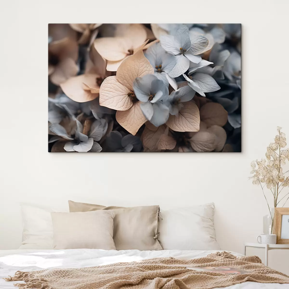 Gemälde Hortensienblüten, hellblaue und beige Blütenblätter, mit detaillierten Texturen, elegantes Blumenarrangement Art. s44394