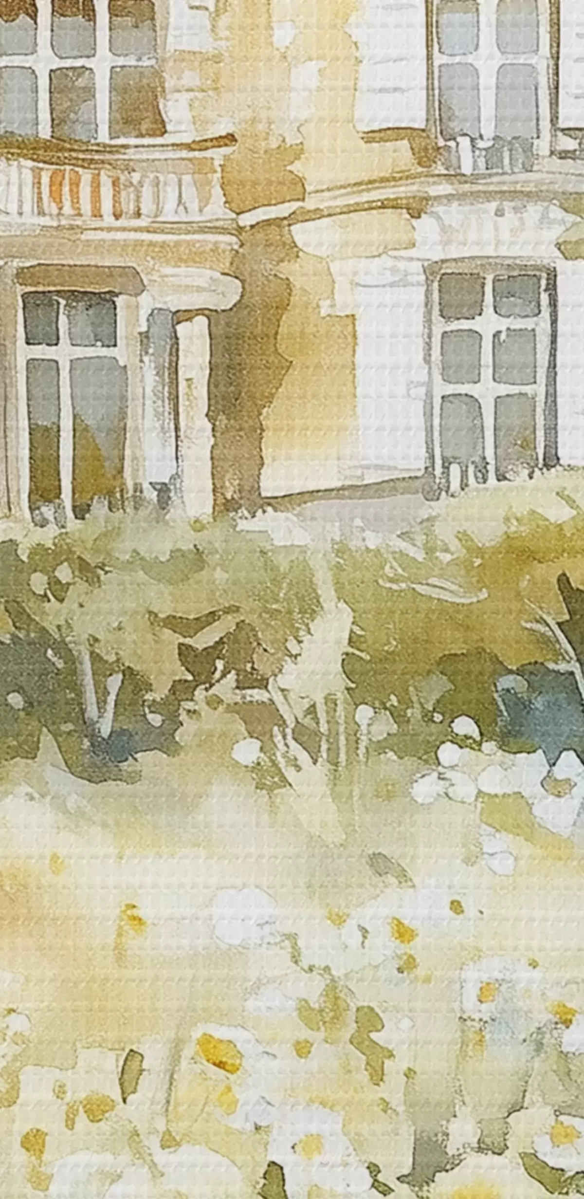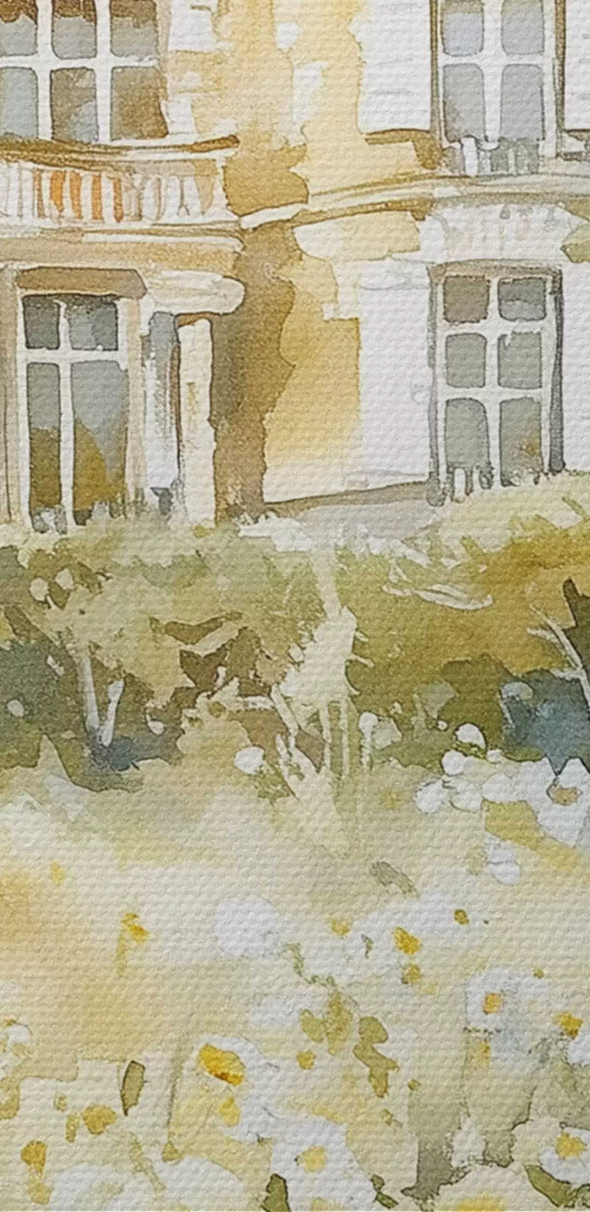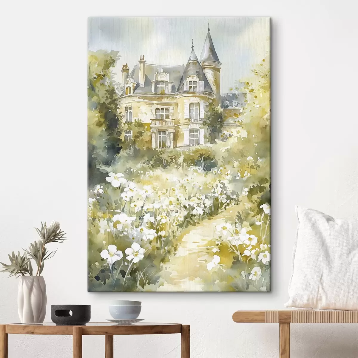 Gemälde Schönes Schloss mit Grünzeug und weißen Blumen, Aquarell-Stil Art. s44506