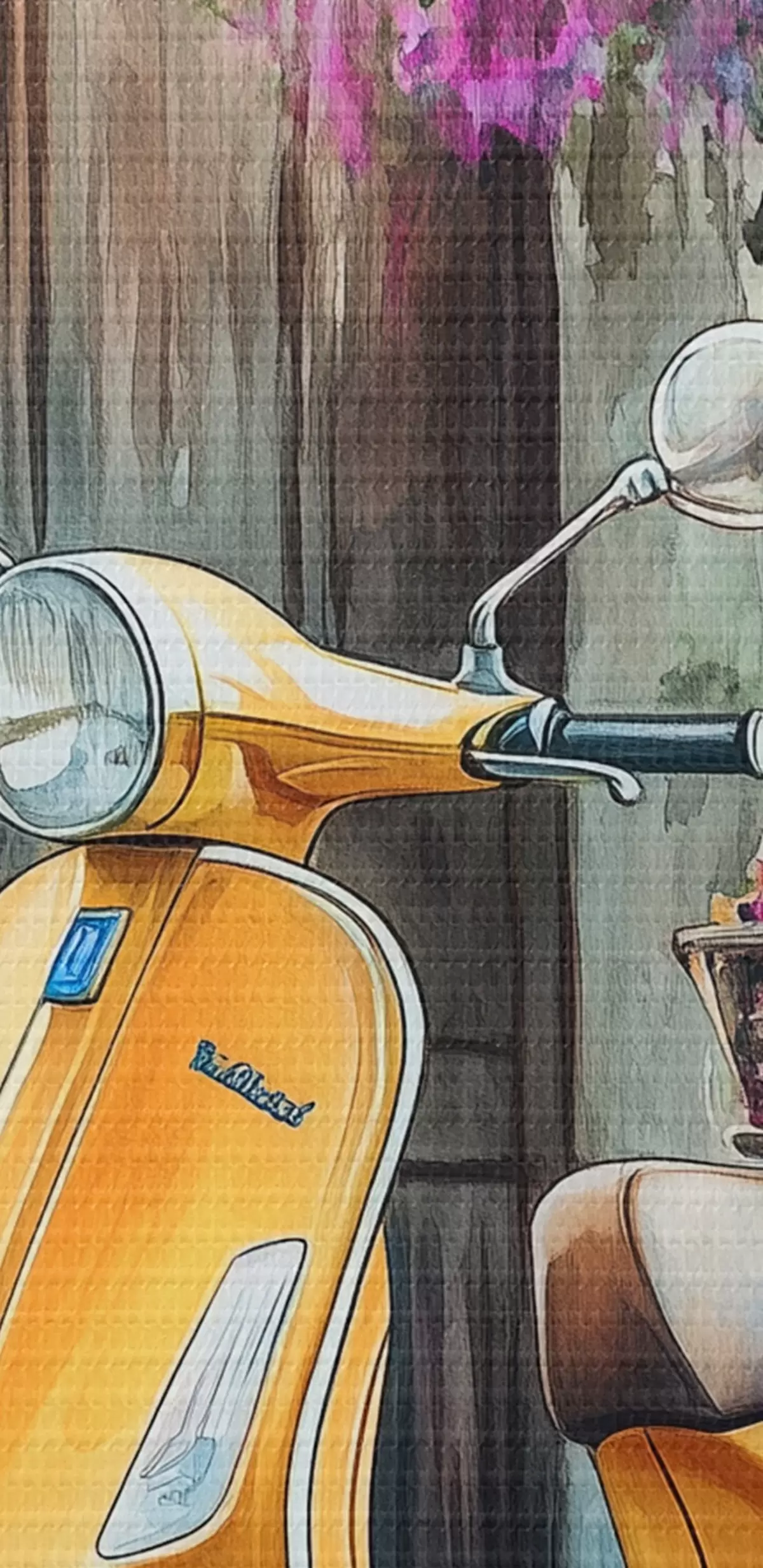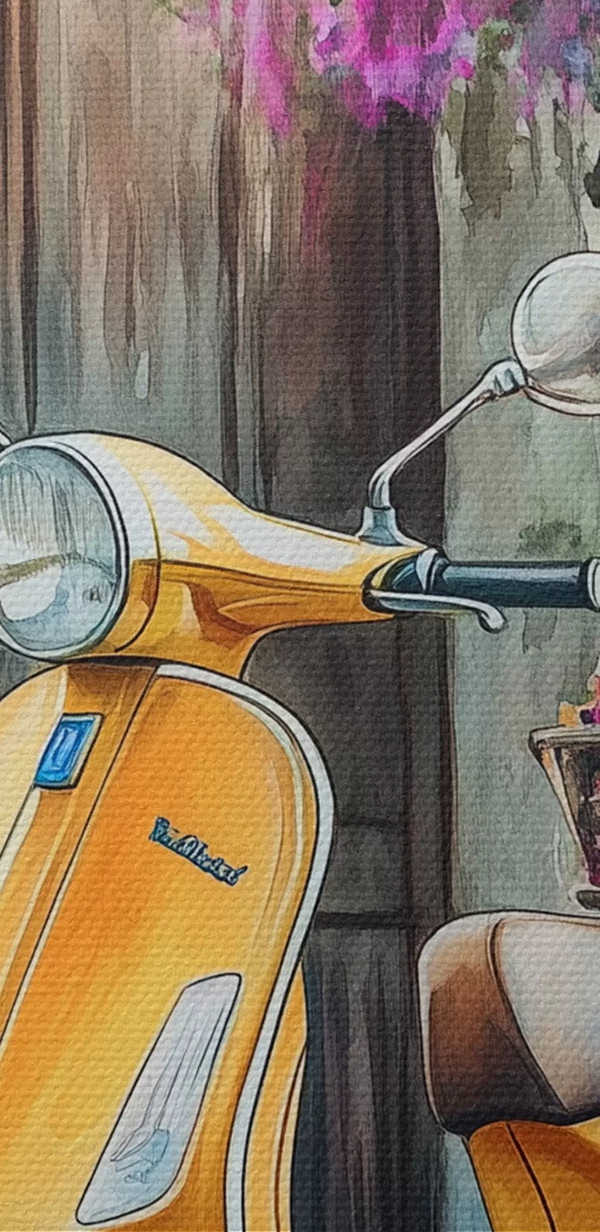 Gemälde Gelber Vespa-Roller in der Nähe der Holztür mit Blumen Art. s44607