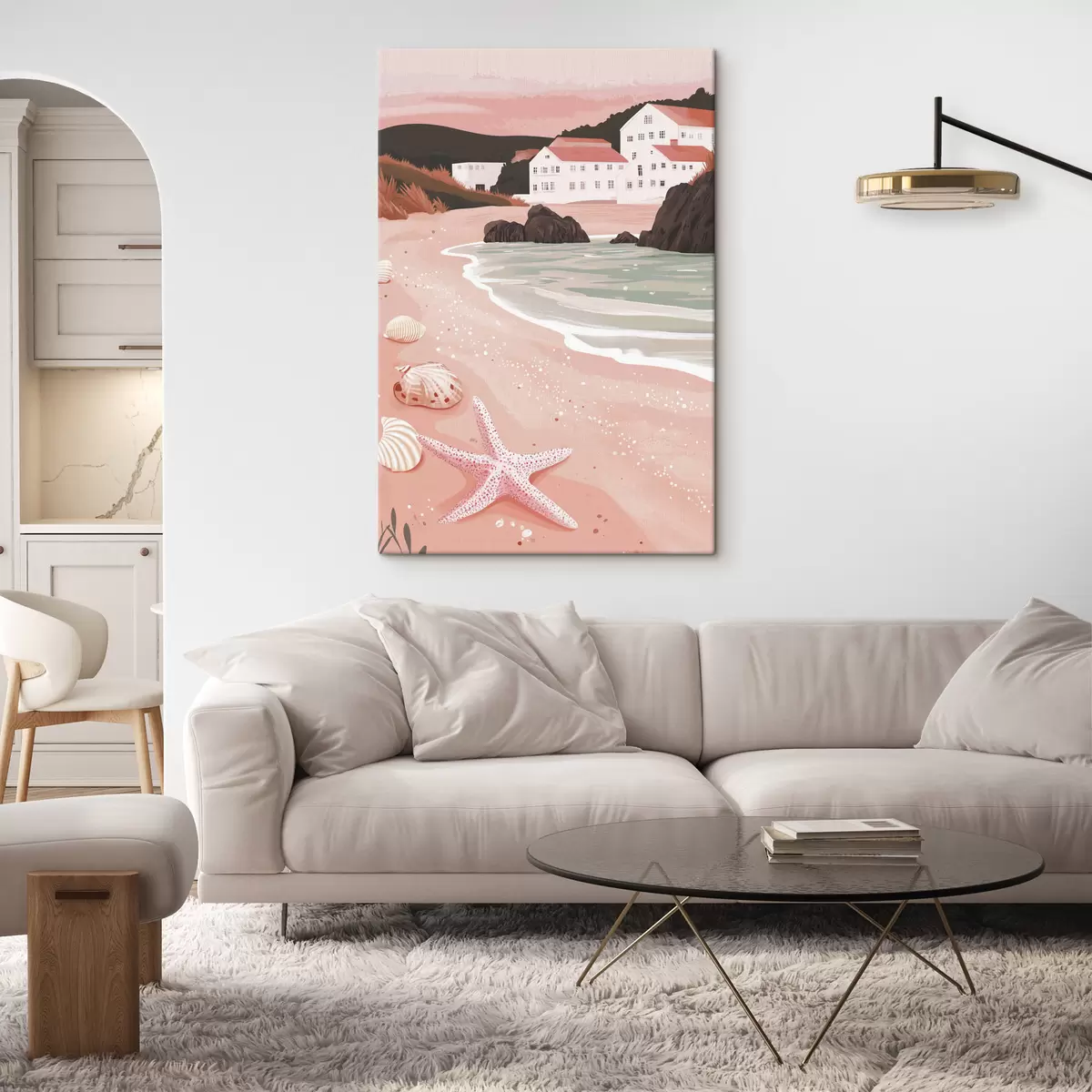 Gemälde Gemütlicher rosa Strand mit weißen Häusern und Muscheln Art. s44713