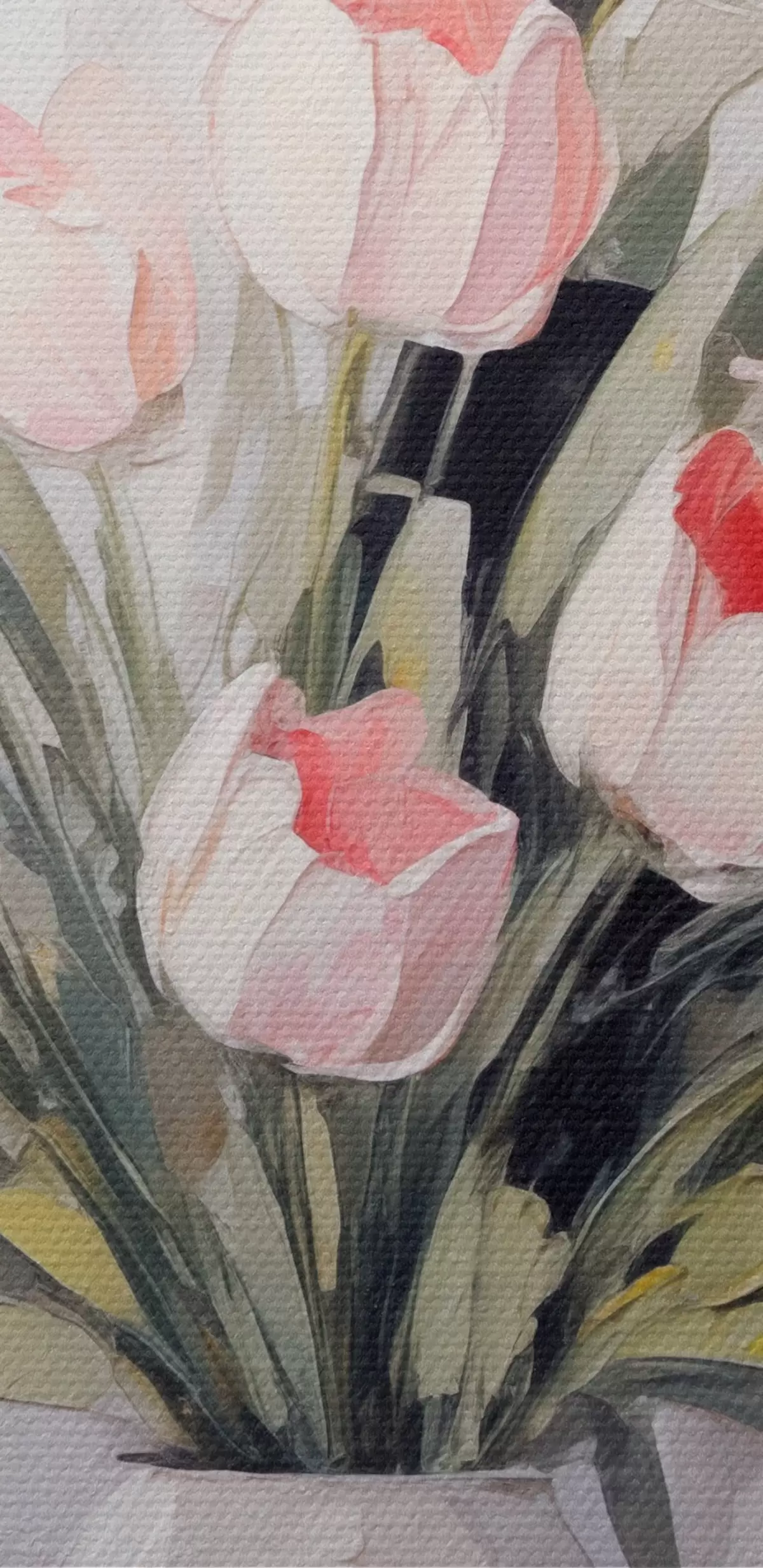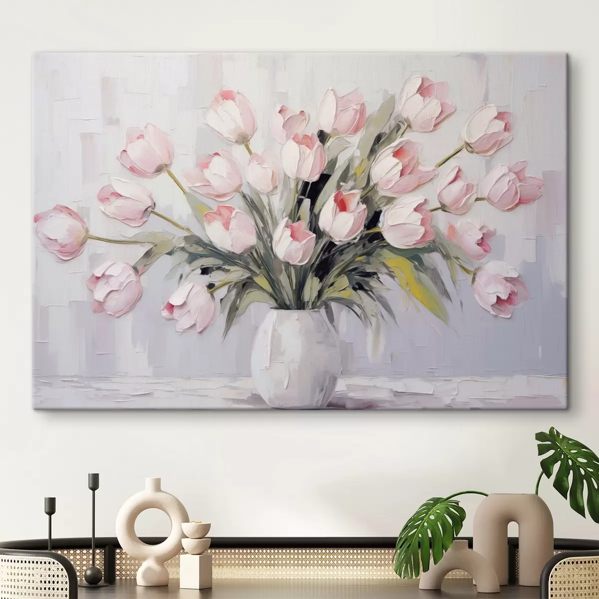 Fototapete Eine Vase mit rosa Tulpen, grüne Blätter, hellgrauer Hintergrund, Ölgemälde Stil, dicke Pinselstriche  s44852