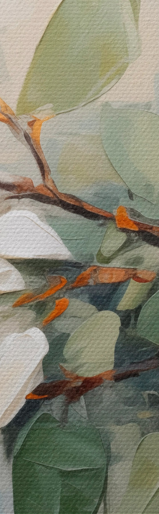 Gemälde Magnolienblüten mit grünen Blättern auf einem Zweig, pastos strukturierter Stil, weiche Farbpalette Art. s44853
