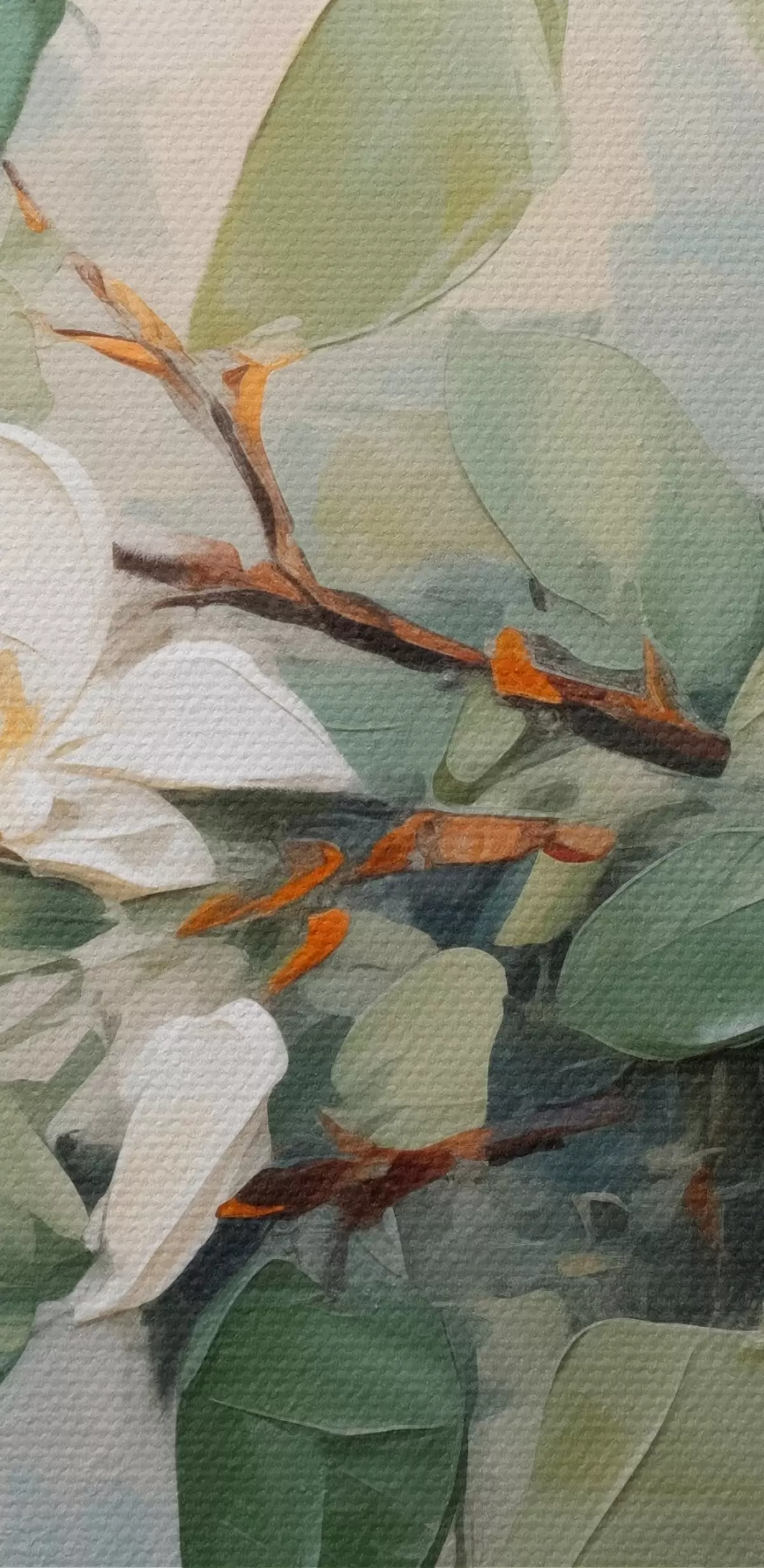 Gemälde Magnolienblüten mit grünen Blättern auf einem Zweig, pastos strukturierter Stil, weiche Farbpalette Art. s44853