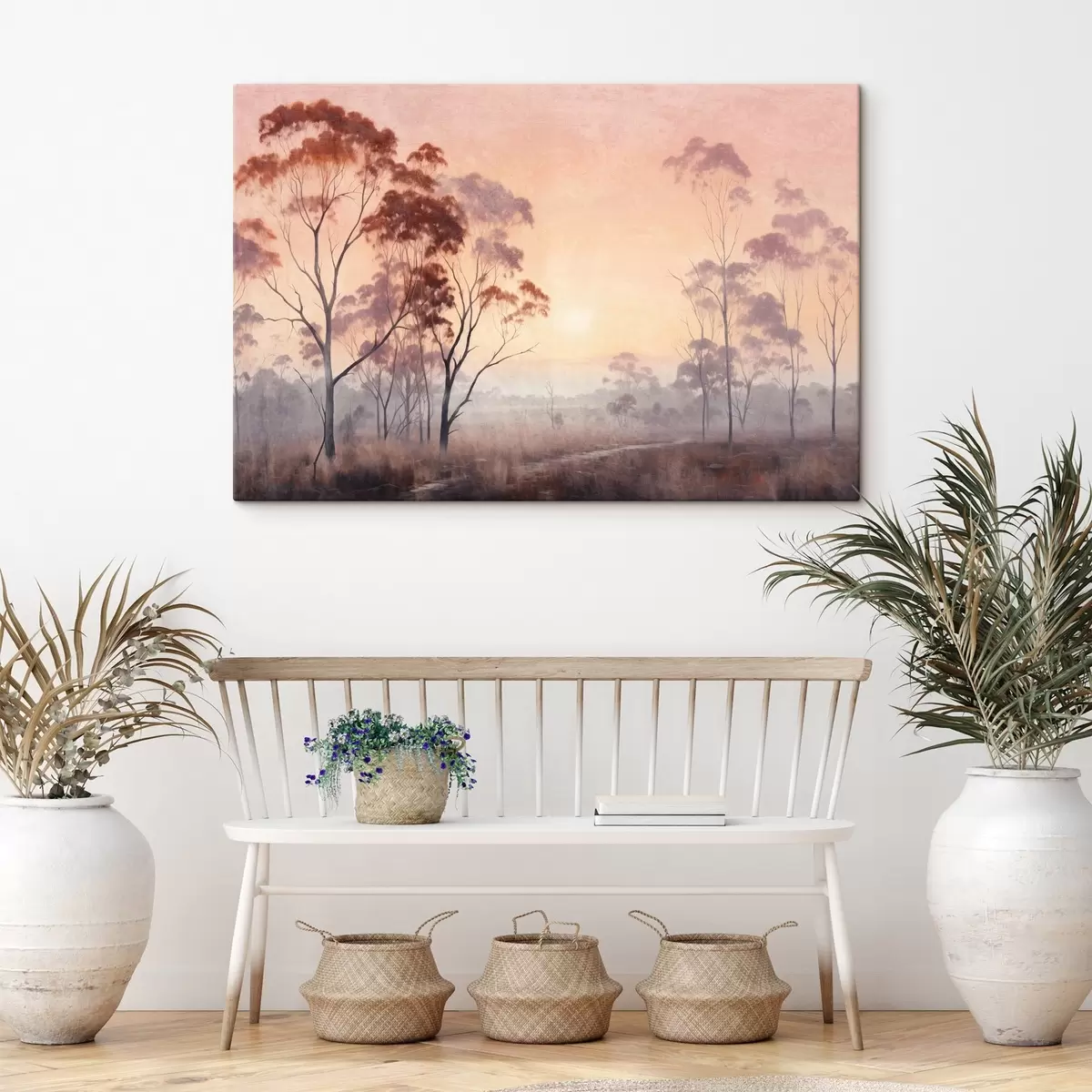 Gemälde Ein Landschaftsgemälde eines Feldes mit hohem Gras und Bäumen, die Sonne ist im Hintergrund Art. s44854