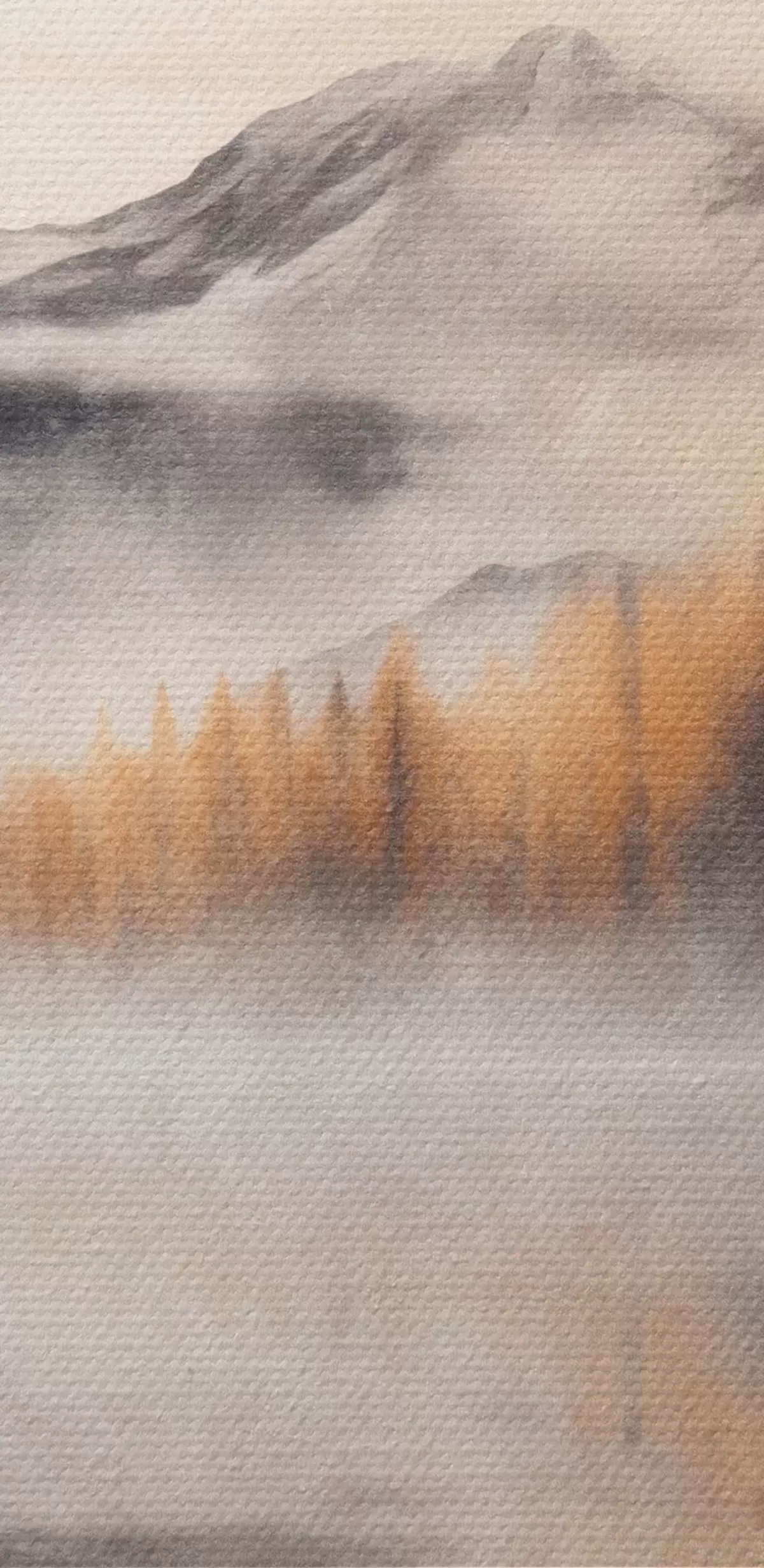 Gemälde Eine neblige, strukturierte Seenlandschaft mit Kiefern und Bergen, wolkenverhangener grauer Himmel Art. s44856