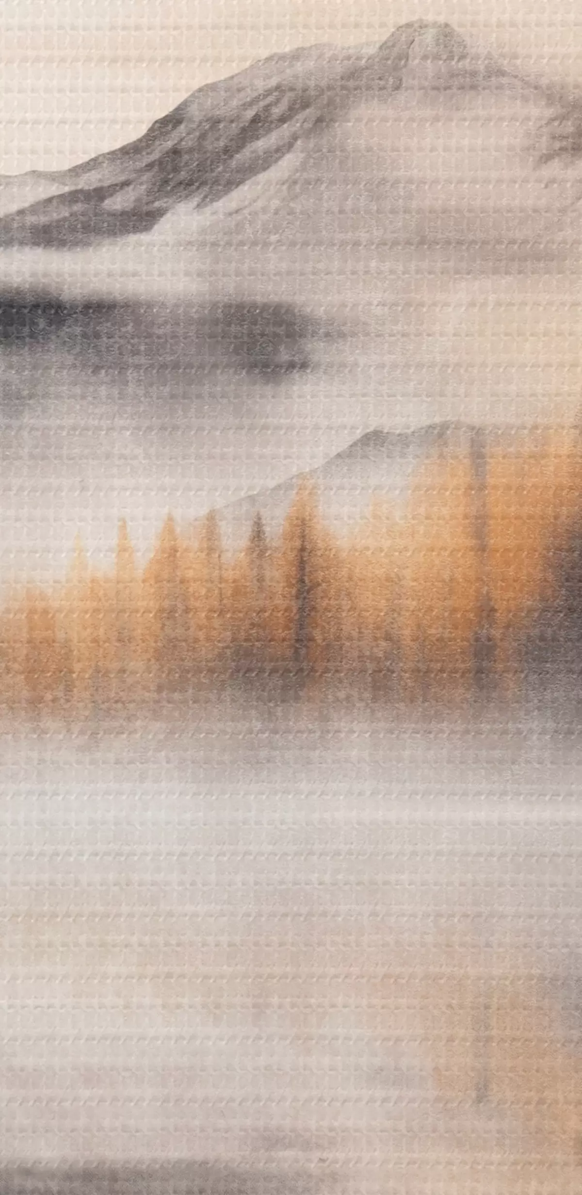 Fototapete Eine neblige, strukturierte Seenlandschaft mit Kiefern und Bergen, wolkenverhangener grauer Himmel  s44856