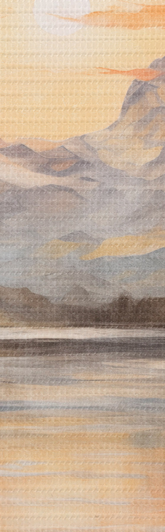 Fototapete Landschaft mit einem See, umgeben von Bäumen und Bergen im Hintergrund, orangefarbener Himmel mit Sonne  s44857