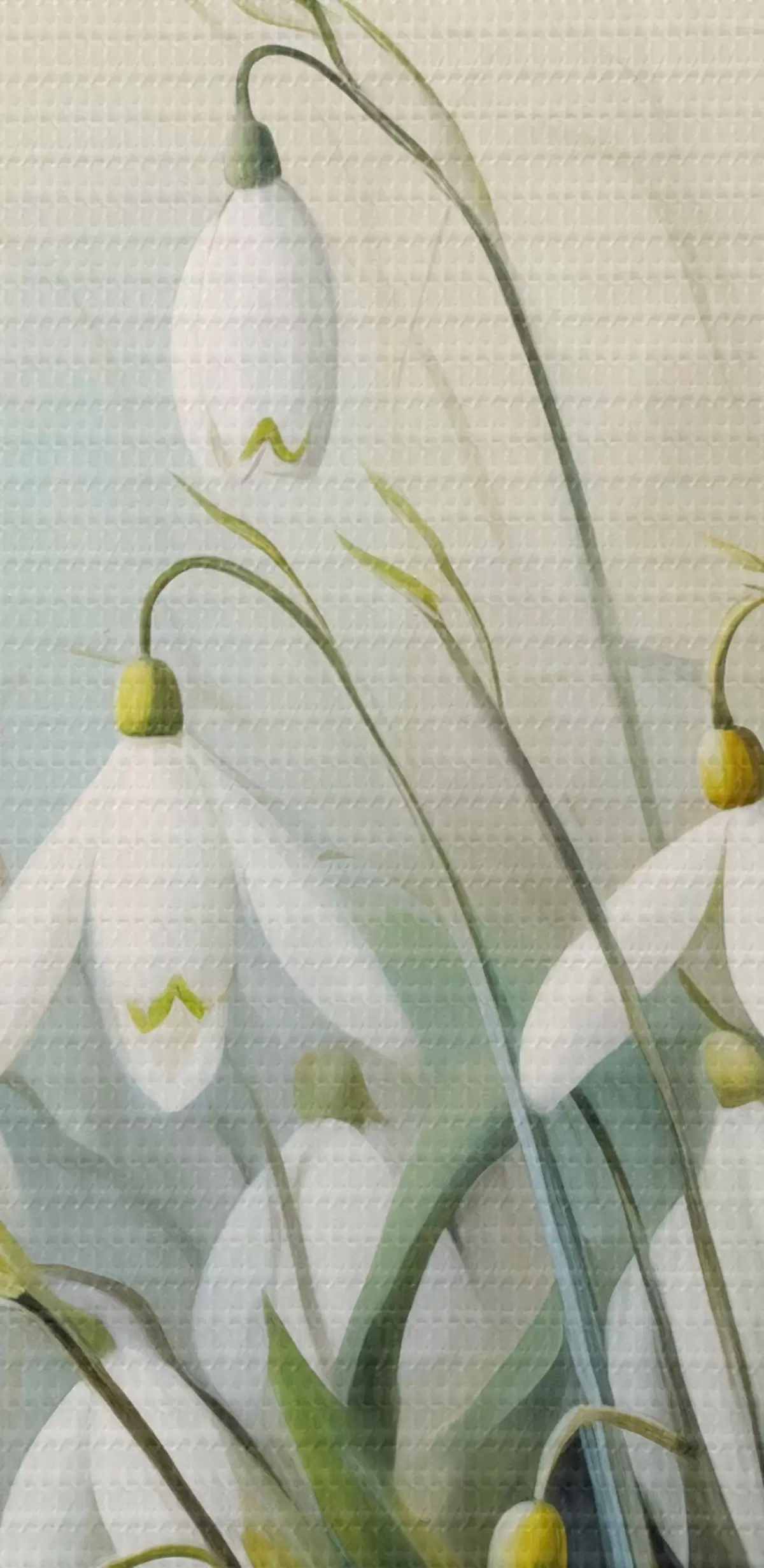 Fototapete Weiße Schneeglöckchenblüten mit blauen und grünen Stängeln und Blättern, weiche Pinselstriche, unscharfer Hintergrund  s44864