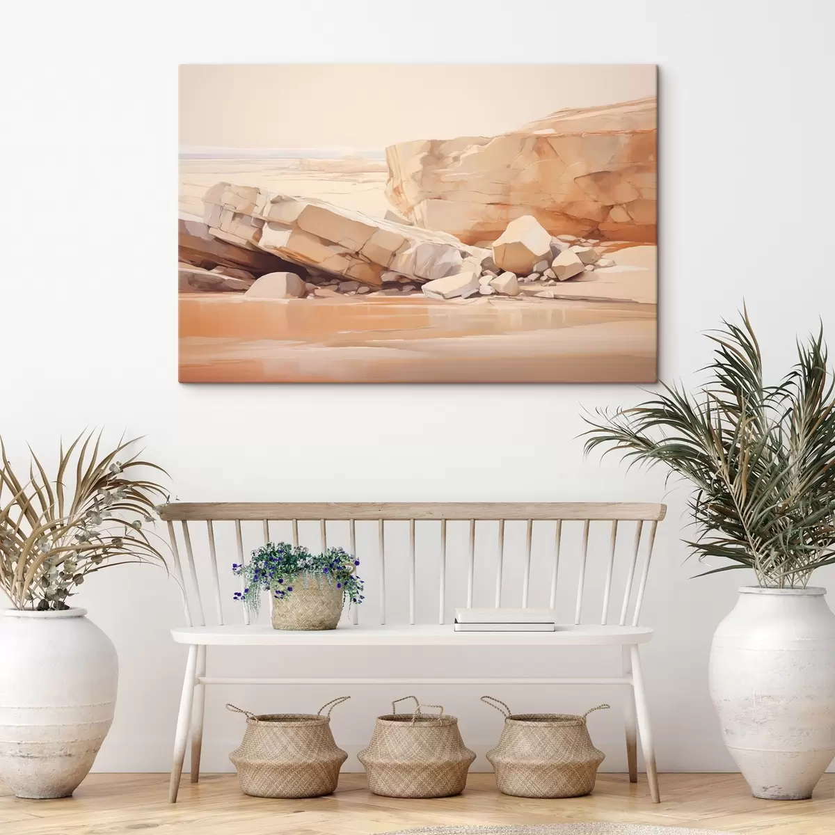 Gemälde Minimalistische felsige Strandlandschaft mit großen hellbraunen Felsblöcken und klarem Wasser Art. s44865