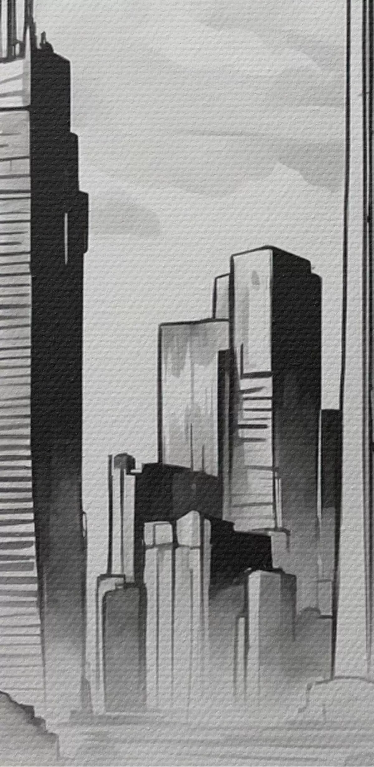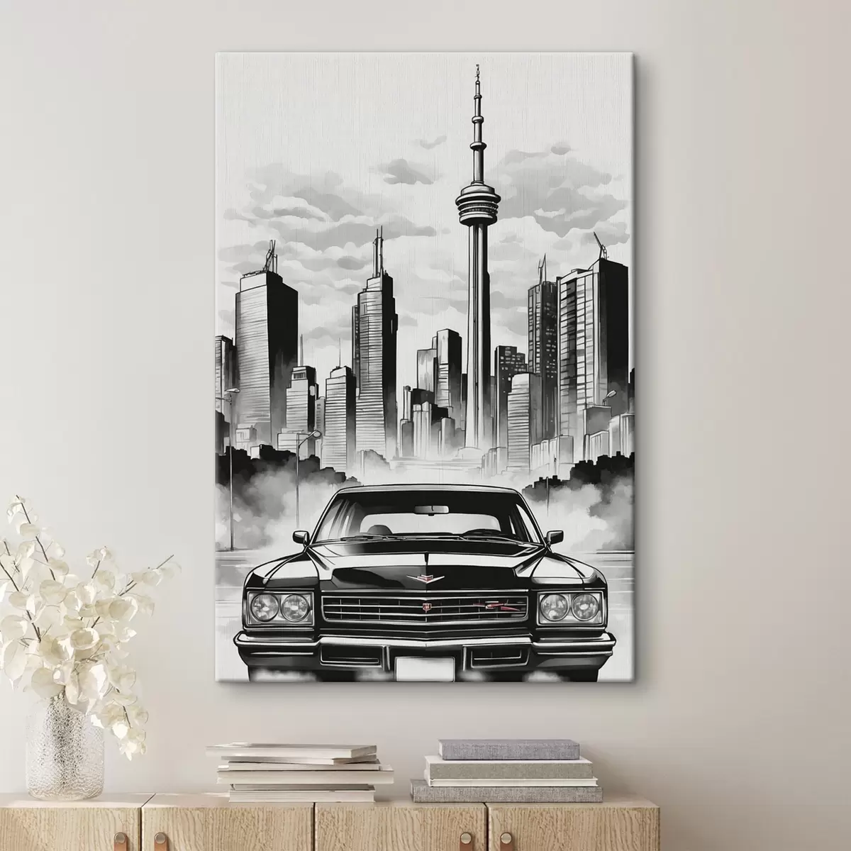 Gemälde Retro-Auto auf dem Hintergrund der monochromen Stadt mit Wolkenkratzern Art. s44871