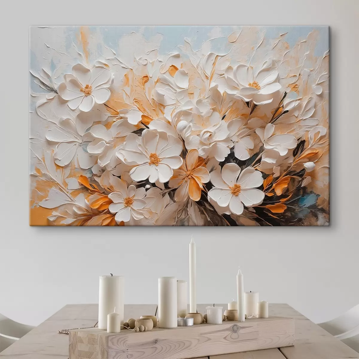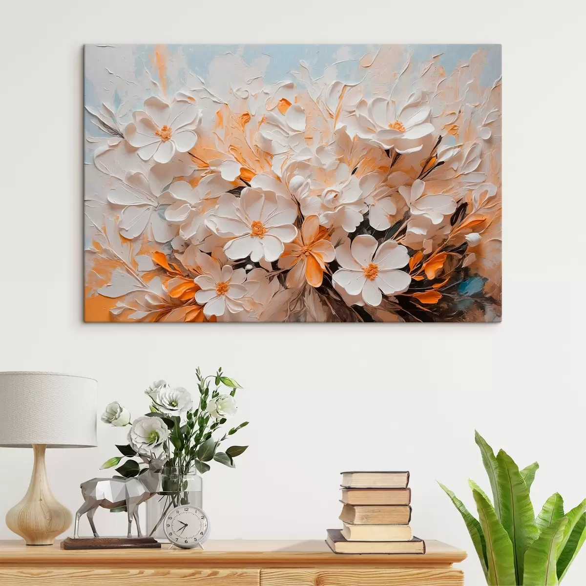 Gemälde Weiße und pfirsichfarbene Blumen auf blauem Hintergrund mit Pastellfarben Art. s44879