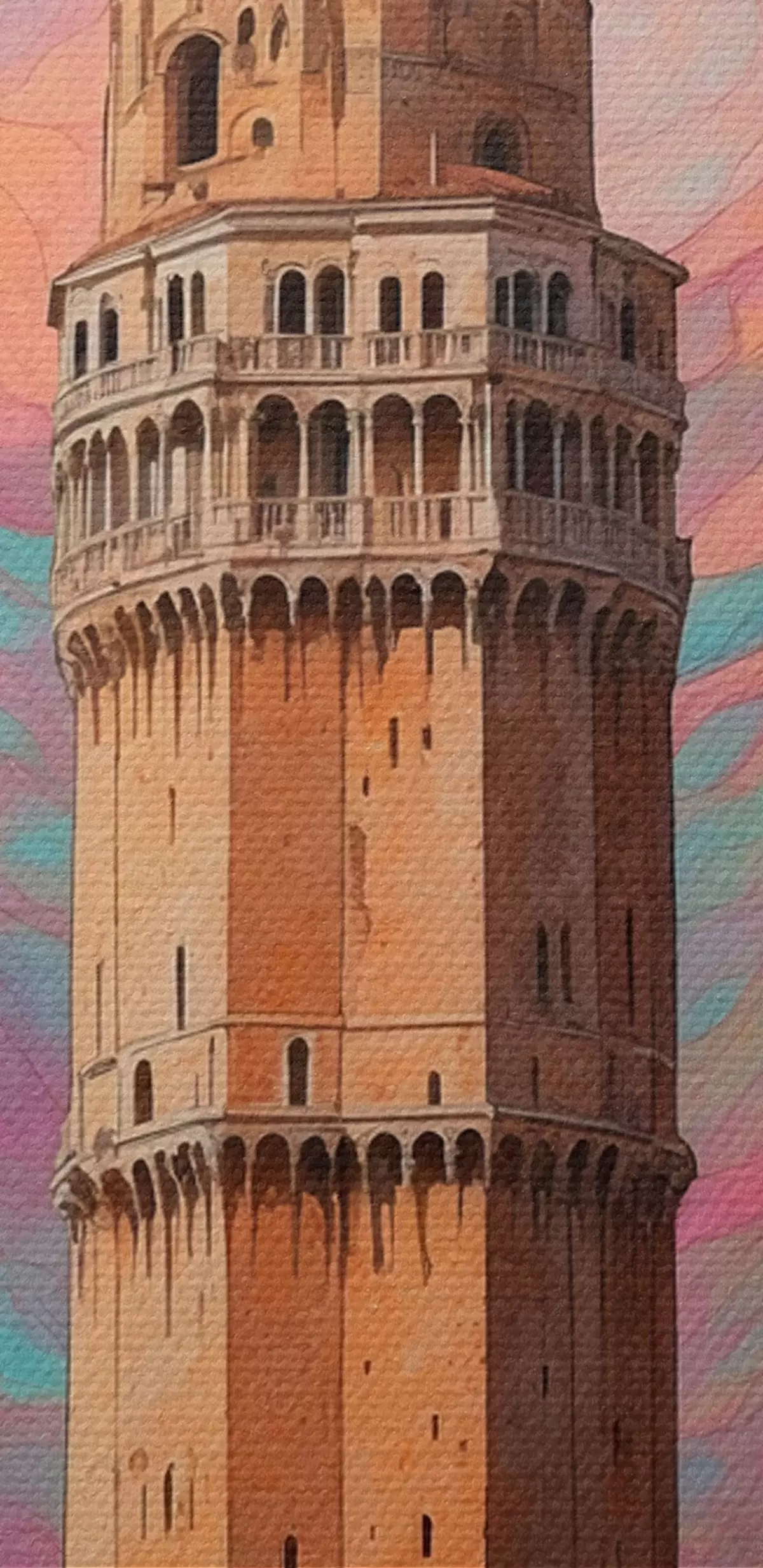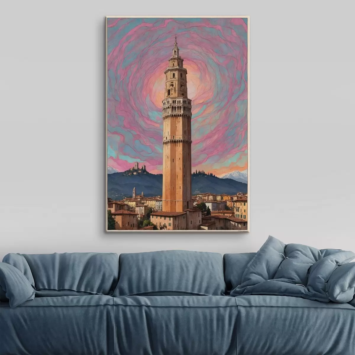 Gemälde Fantasieturm gegen den Himmel mit rosa und blauen Spiralen Art. s44885