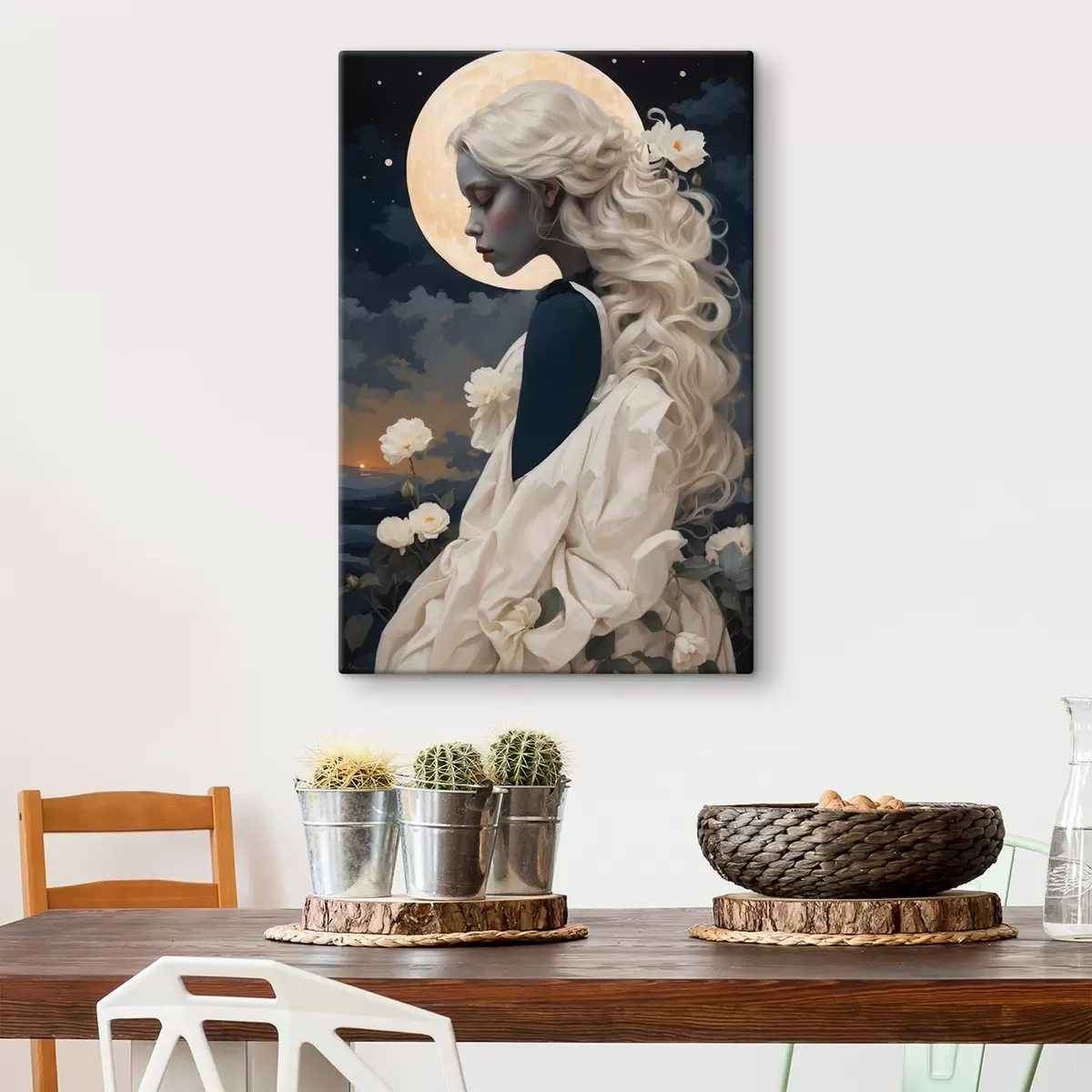 Gemälde Porträt eines Mädchens mit weißem Haar und Vollmond Art. s44887