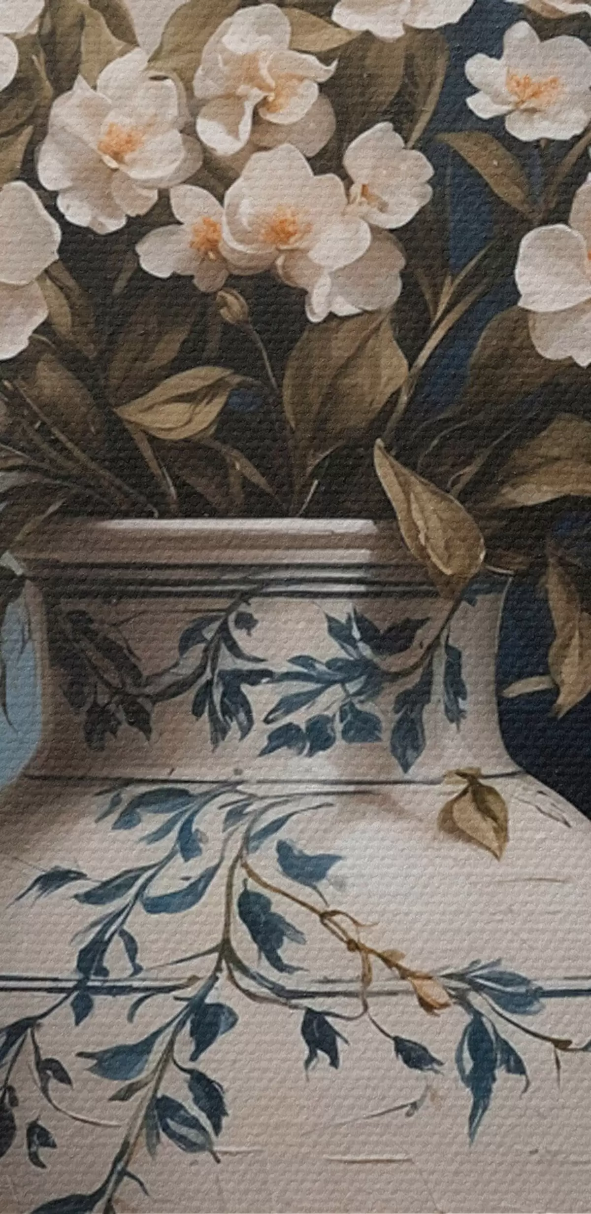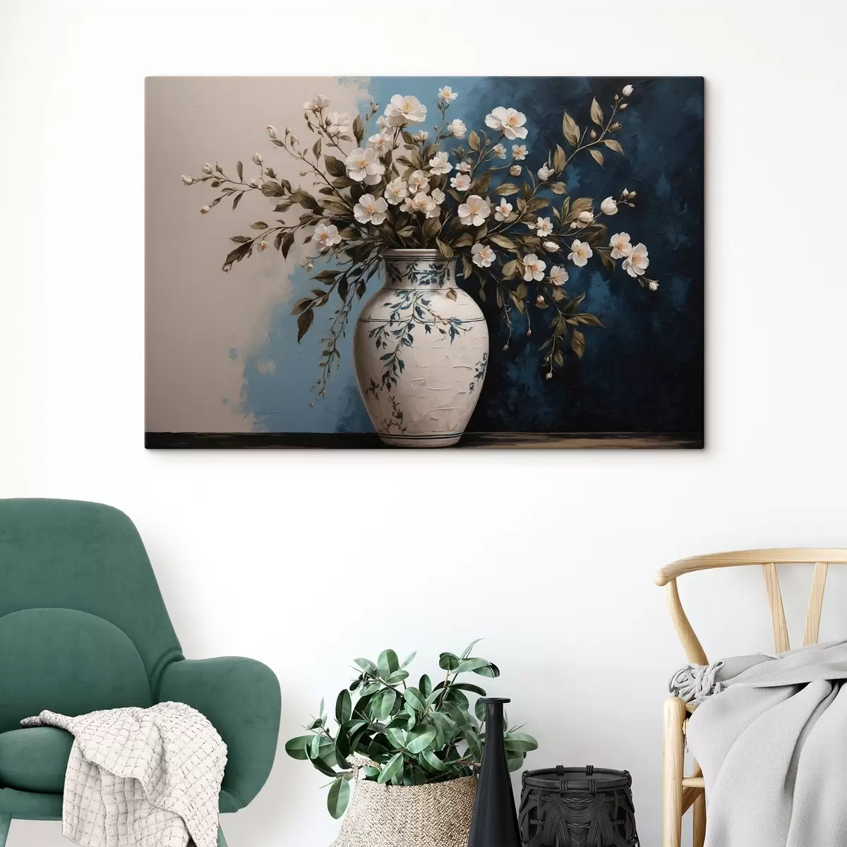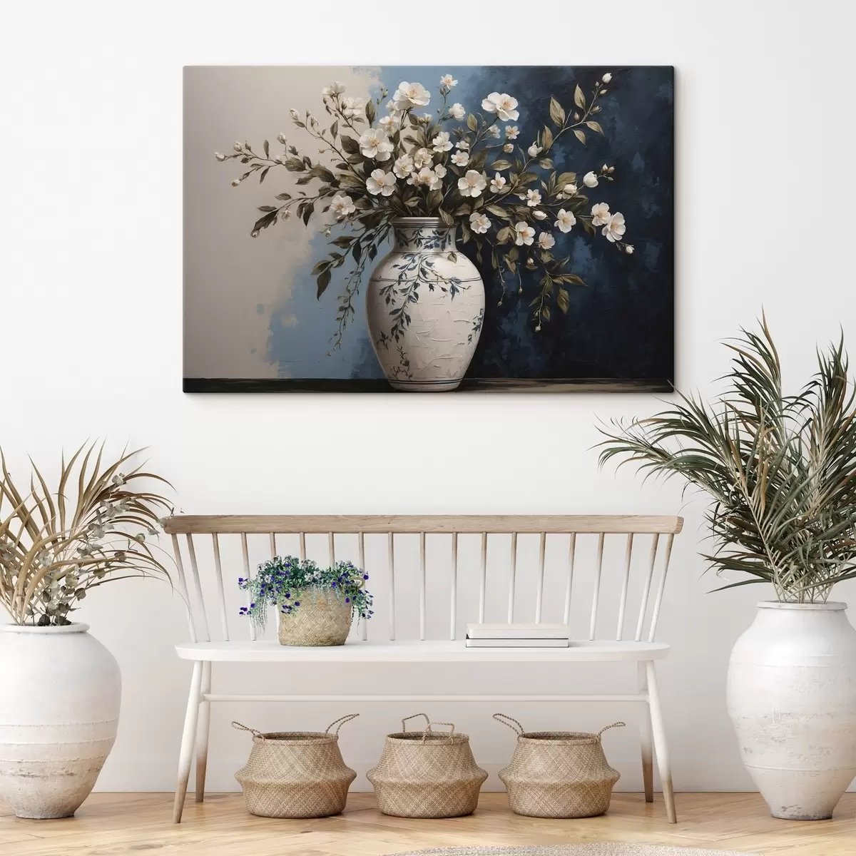 Gemälde Weiße und gelbe Blumen in einer großen Vase auf blauem Hintergrund Art. s44893